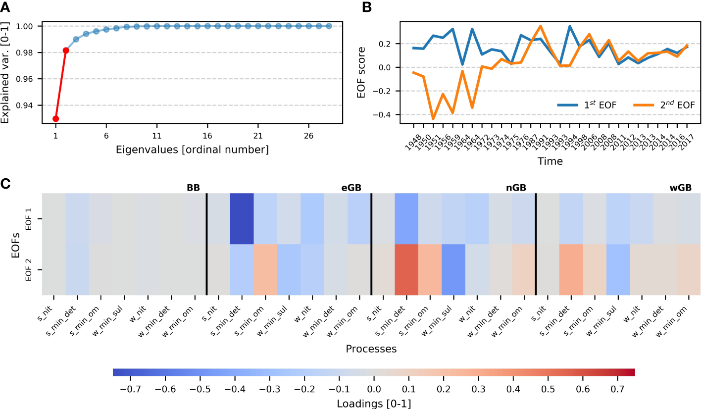 Results of the EOF analysis for oxygen consumption during inflow events. Panel (A) demonstrates the fraction of variance explained by the EOFs. The first two EOFs (which explain more than 95% of the variance) are marked by red color. Only those two EOFs were considered. Panel (B) shows timeseries of the first two EOFs. Note that the x-axis in panel A is not equidistant (see caption of Figure 8). The first EOF exhibits a stationary pattern, whereas the second demonstrates some non-stationarity. Panel (C) shows the EOF loadings, which indicate how a certain EOF is connected to a certain process. Positive values (red) indicate a direct relationship between EOF and a process, negative (blue) - a reverse relationship. It is visible that the first EOF shows reverse relationships with all processes, but the second shows both types of relationship. Processes are read the same way as in Figure 8, but with the ending indicating a certain sub-basin. The processes in the matrix are sorted in the following way: the Bornholm Basin, the eastern Gotland Basin, the northern Gotland Basin, and the western Gotland Basin. Black vertical lines denote the boundaries between sub-basins. See Supplementary Table 1 for the definition of the names of processes.