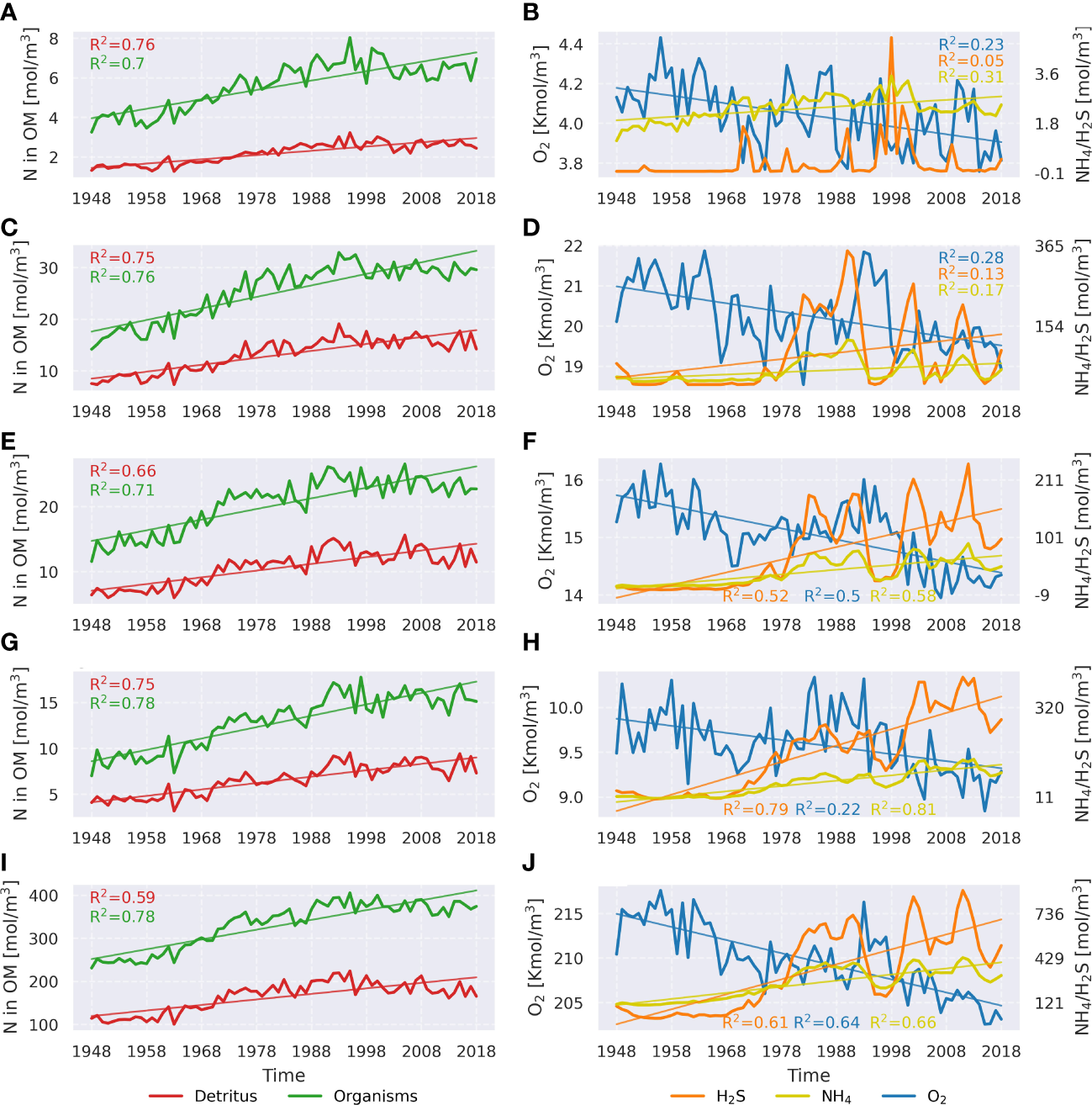 Linear trends of some important variables actively participating in oxygen and hydrogen sulfide dynamics. Left panels depict detritus concentration and concentration of living organisms (phytoplankton and zooplankton) integrated over the whole water column and all sub-basins: the Bornholm Basin (A, B), the eastern Gotland Basin (C, D), the northern Gotland Basin (E, F), the western Gotland Basin (G, H), and the whole central Baltic Sea (I, J). All variables are represented by nitrogen in organic matter (N in OM). Right panels show the dynamics of oxygen, hydrogen sulfide, and ammonium. Only significant linear trends (p<0.05) are shown.