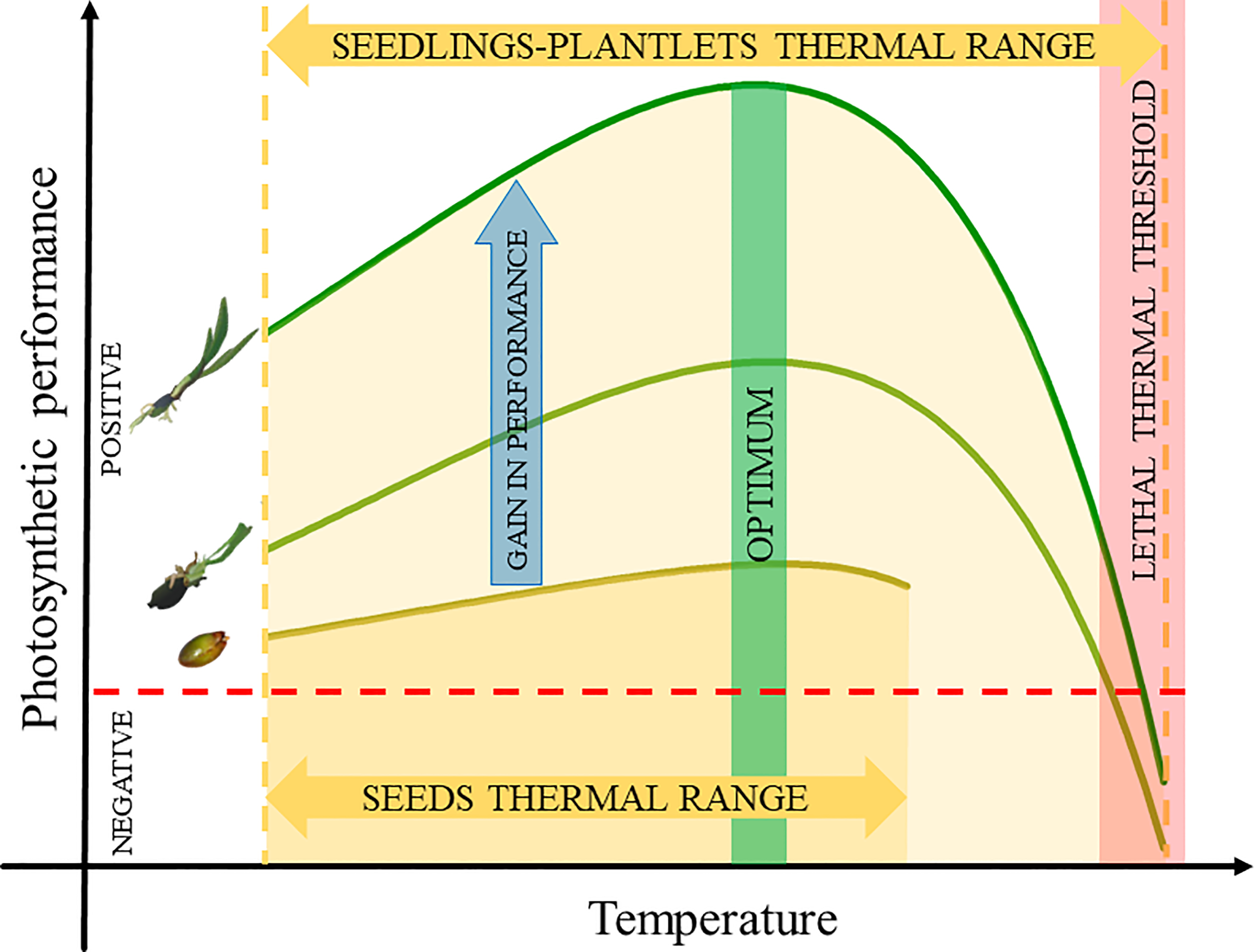 The breadth of thermal performance for photosynthesis of seedlings and plantlets was larger than that of seeds, reaching maximum photosynthetic rates at 28-30°C and then decreasing to complete inhibition at 34-36°C. The photosynthetic TPC models, indeed, showed a clear age-dependent photosynthetic thermal sensitivity as indicated by the values of thermal tolerance, thermal safety margins, critical maximum temperatures (CT_max) and safety margin values, which were progressively higher with the developmental stage of the individuals (seeds < 4-month-old seedlings < 16-month-old plantlets; Table 1).