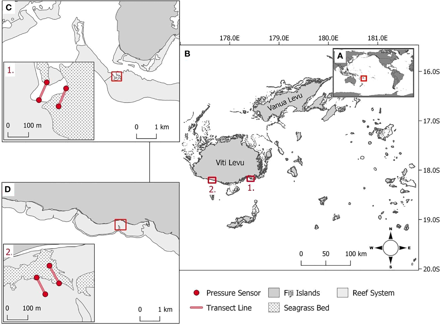 (A) Fiji’s position within the South Pacific Ocean. (B1) Suva Lagoon and (B2) Maui Bay are the two study locations on the island of Viti Levu. (C) Within Suva Lagoon and (D) Maui Bay, pressure sensors (red dot markers, inserts C1, D2) were deployed 100m apart on either end of the seagrass bed and non-seagrass (control) bed denoted with transects (red line, inserts C1, D2).