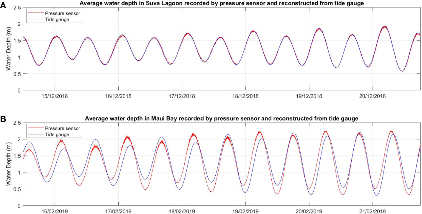 Comparison of time series water depth data recorded by the pressure sensors deployed in the current study with water depth data over the same time period measured by existing semi-permanent tide gauges in the two study locations (A) Suva Lagoon and (B) Maui Bay.