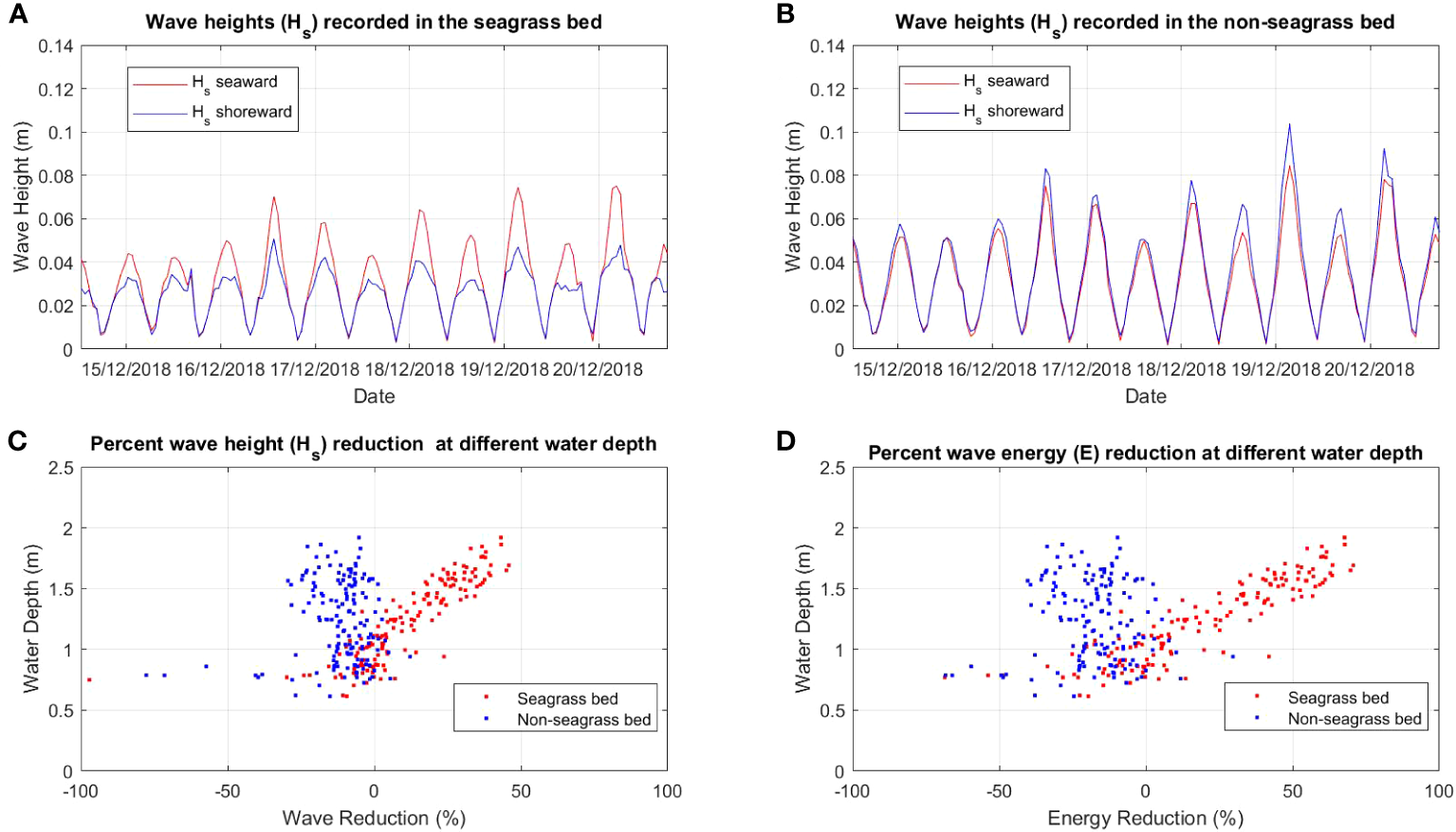 Comparison of wave height (Hs) between (A) seagrass bed and (B) non-seagrass bed (control) and the percent of wave (Hs) reduction (C) and wave energy (E) reduction (D) at different water depths in the seagrass bed area and non seagrass area in Maui Bay.