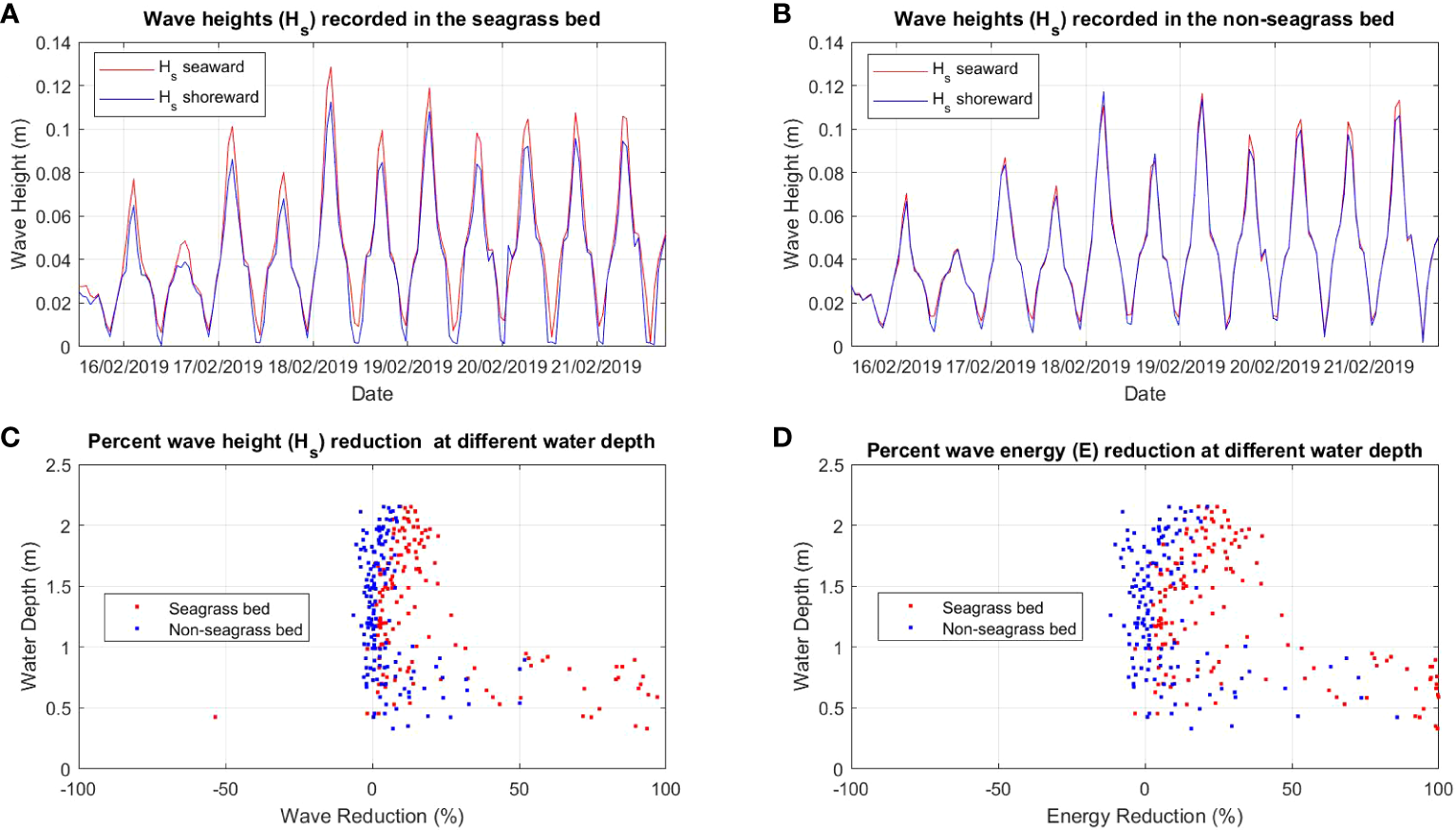 Comparison of wave height (Hs) between (A) seagrass bed and (B) non-seagrass (control) bed and the percent of wave (Hs) reduction (C) and wave energy (E) reduction (D) at different water depths in the seagrass bed area and non seagrass area in Suva Lagoon.