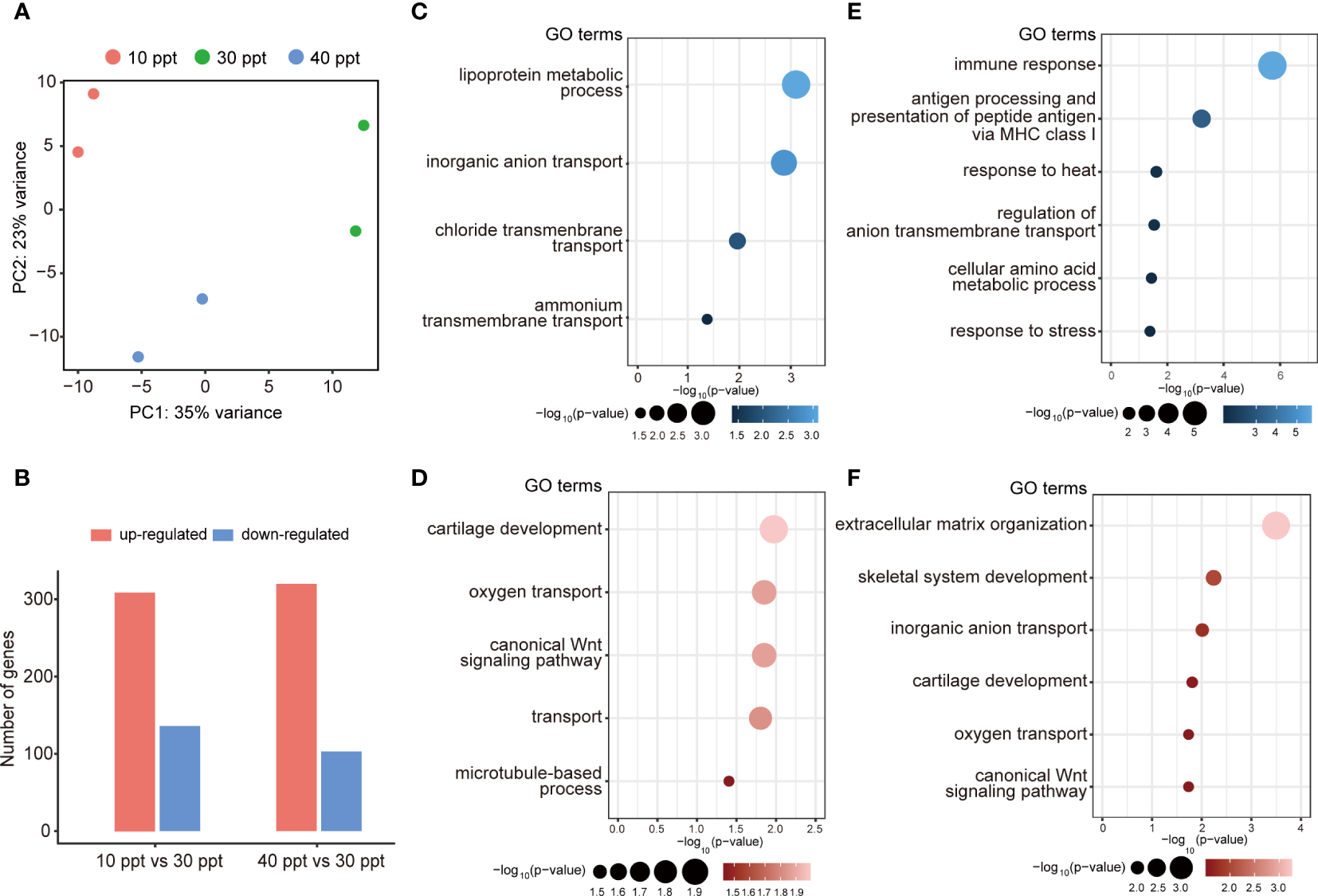 Summary of differentially expressed genes (DEGs) in the gills under different salinity stress. (A) Principal component analysis (PCA). (B) The number of up- and down-regulated DEGs for each comparison in gills. (C, D) Featured GO terms enriched for the down-regulated DEGs (C) and up-regulated DEGs (D) under 10 ppt condition compared to 30 ppt. (E, F) Featured GO terms enriched for the down-regulated DEGs (E) and up-regulated DEGs (F) under 40 ppt condition compared to 30 ppt.
