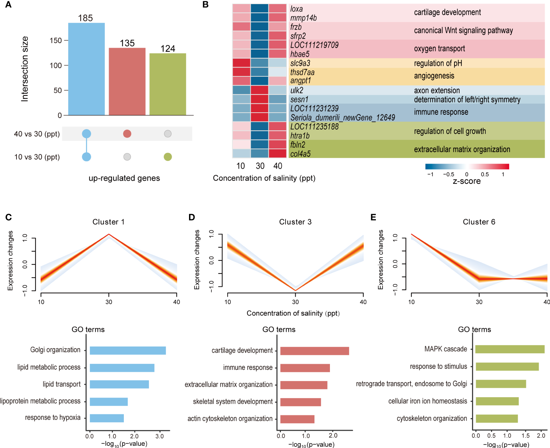 Compared to the CK, the expression levels of 185 DEGs were enhanced in both 10 and 40 ppt salinity groups, which indicates that these genes participate in the responses to both hypo- and hyper-salinity stress (Figure 2A). Of these, the expression levels of 135 and 124 DEGs were specifically induced in 40 and 10 ppt treatment groups, respectively. The significant candidate genes in response to salinity stress in gills are listed in the heatmap, including slc9a3, loxa, mmp14b, col4a5, and so on (Figure 2B). To investigate the transcriptional dynamics across different salinities, we grouped the genes into six clusters according to the similarities in their expression profiles. Of these, three clusters (1, 3, and 6) were statistically significant (p-value = 8.55e-06, 4.12e-07, and 6.21e-14; Figures 2C–E). In cluster 1, gene expression was increased when the salinity varied from 10 to 30 ppt but reduced as the salinity increased from 30 to 40 ppt. GO enrichment analysis suggested that genes in cluster 1 were involved in lipid metabolism and transport, Golgi organization, and response to hypoxia (Figure 2C). In contrast, the expression levels of genes in cluster 3 were enhanced when the salinity altered from 30 ppt to either 10 or 40 ppt. These genes were significantly enriched in the immune response, cartilage development, extracellular matrix organization, skeletal system development, and actin cytoskeleton organization (Figure 2D). Genes in cluster 6 were substantially down-regulated following the salinity change from 10 to 30 ppt and retained a similar level between 30 and 40 ppt salinity. These genes participated in the mitogen-activated protein kinase (MAPK) cascade, response to stimulus, retrograde transport, endosome to Golgi, cellular iron ion homeostasis, and cytoskeleton organization (Figure 2E).