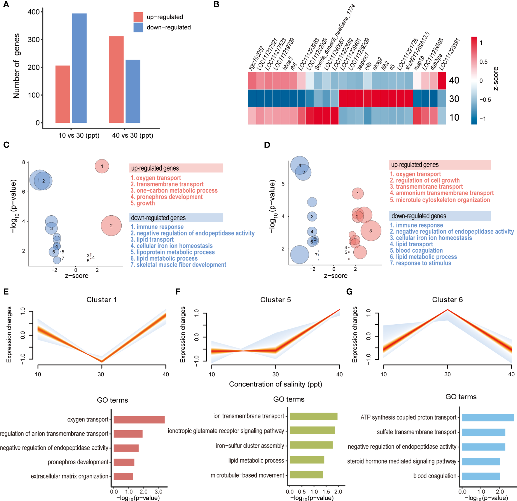 Transcriptomic alterations in the kidneys under different salinity stress. (A) The number of up- and down-regulated differentially expressed genes (DEGs) for each comparison in the kidneys. (B) Heatmap showing gene expression profiles of DEGs under three salinity concentrations (10, 30, and 40 ppt). (C, D) Featured GO terms enriched for the up- and down-regulated DEGs under 10 ppt (C) and 40 ppt conditions (D) compared to 30 ppt. Bubble plot showing the featured GO terms enriched for the DEGs induced by 10 (C) and 40 ppt (D) salinity treatments. (E-G) Significantly enriched clusters of genes with similar expression profiles across three salinity concentrations (10, 30, and 40 ppt). For each cluster, the expression trend of each gene was represented by one line, and the density of lines was highlighted by the intensity of colors (the denser, the more red). Featured GO terms enriched for the genes of each cluster are shown below.