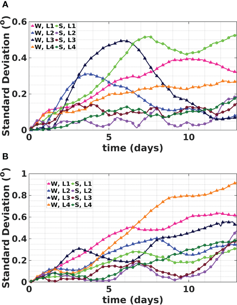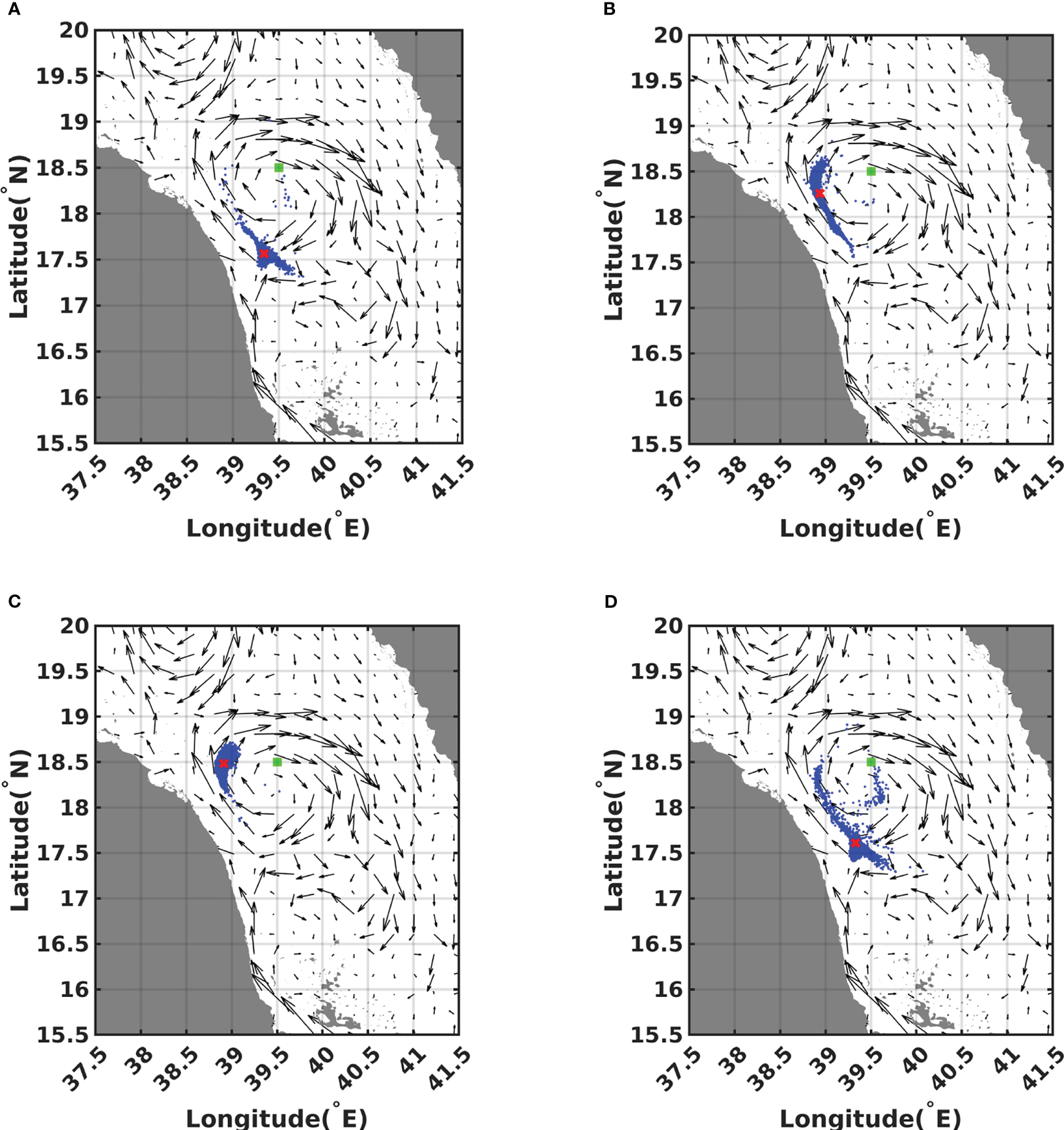 The release locations in the central RS cover the center and periphery of a long-lived eddy that experiences predictable movement during summer but more complex chaotic motion during winter. The release location in the northern RS is prone to strong wind effects that generate strong waves during summer. The circulation in the north is also dominated by mesoscale eddies that intensify in energy in winter. Finally, release Location 4 is selected to examine the influence of the metocean conditions in the south, which are tightly related to the Indian Monsoon, and the effect of the inflow current from the Arabian Sea. In the analysis below, Location 1 is the release location in the northern RS, and Location 2 is the release location at the center of the eddyin the central RS. Location 3 is the release location at the periphery of the eddy in the central RS, and Location 4 is the release location in the southern RS.