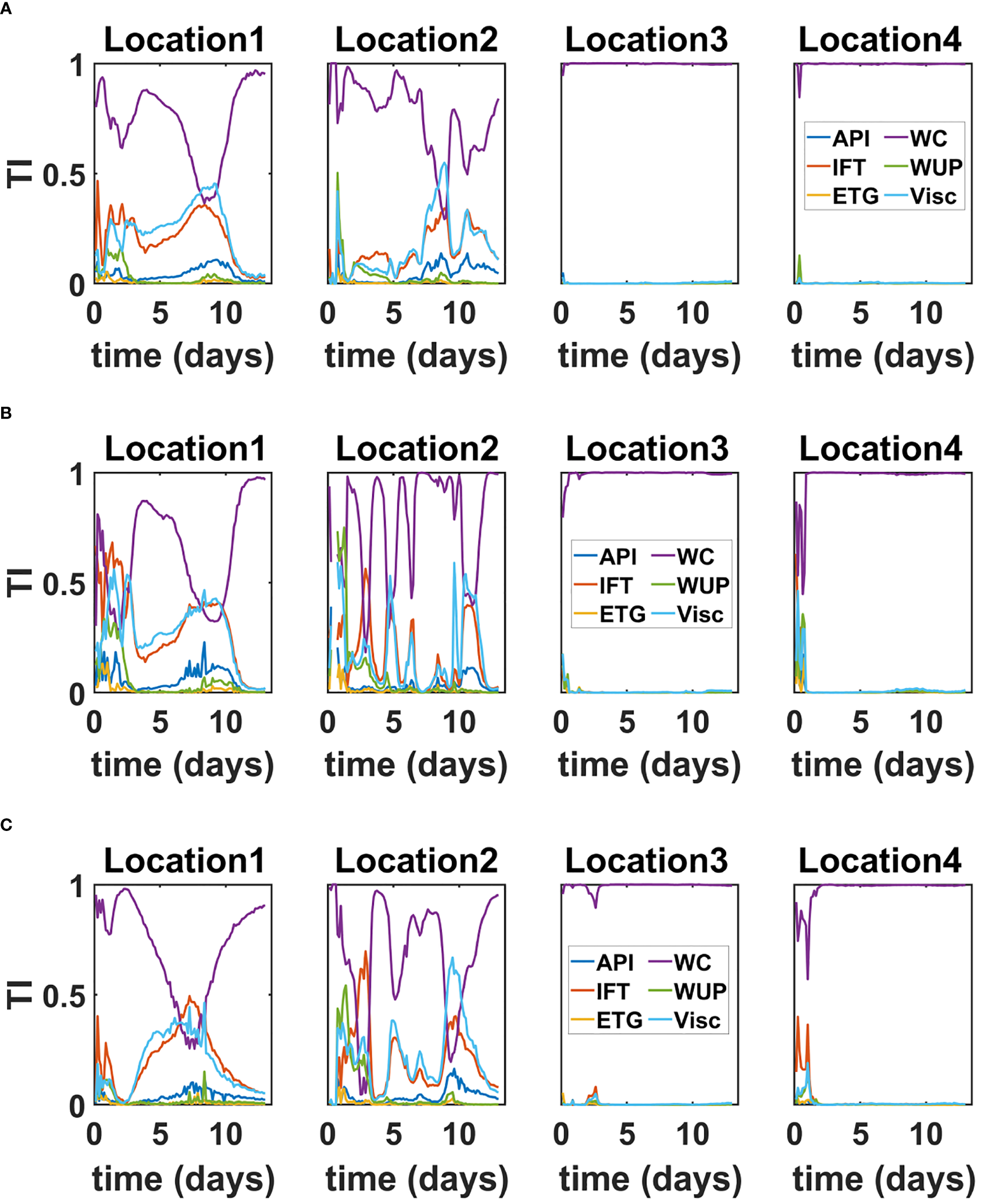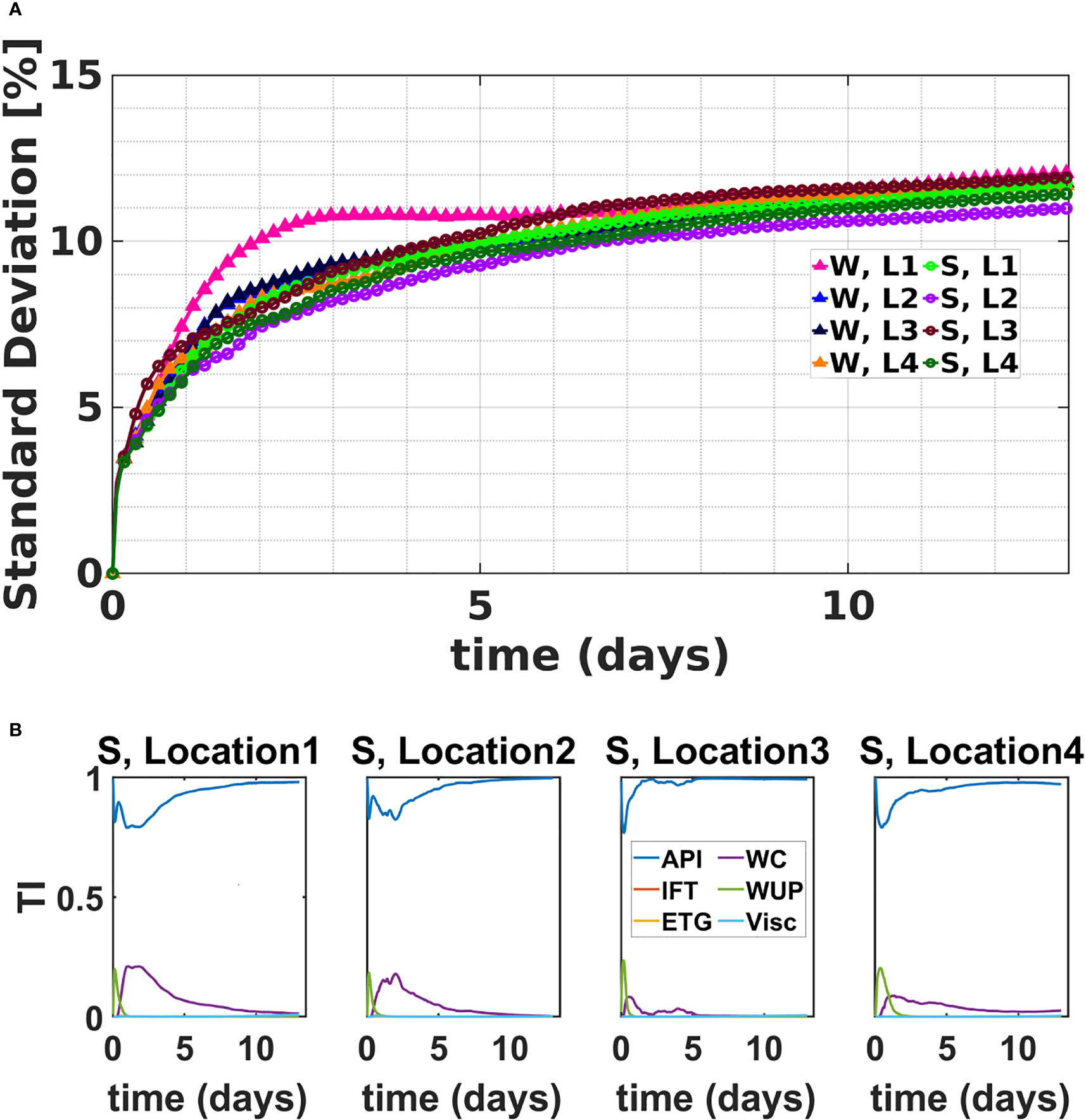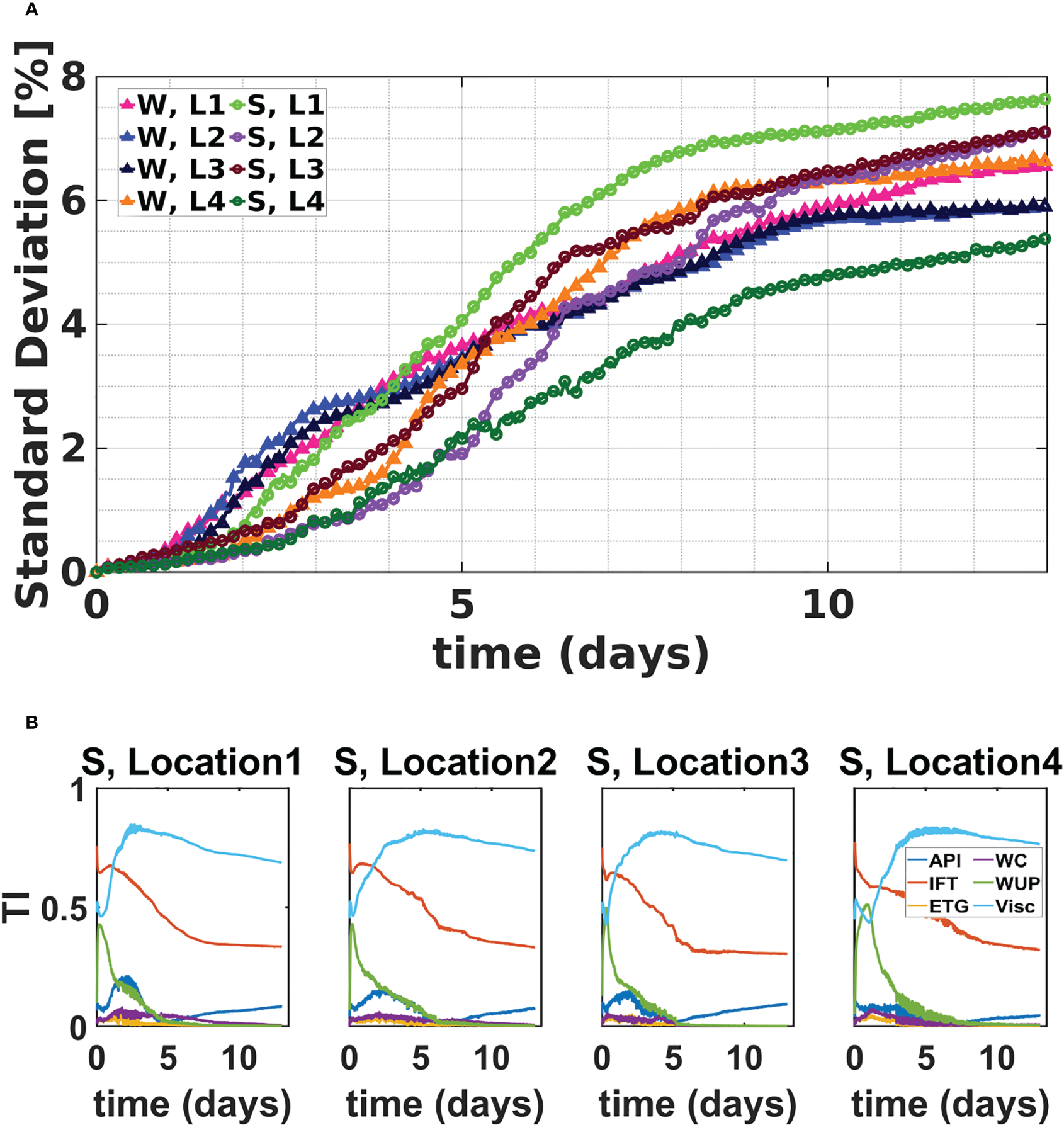 The effects of each parameter in Table 2 on the QoIs were analyzed, focusing on the resulting total (peak-to-peak) variability. The results indicated that the parameters with the strongest influence on the QoIs consisted of oil properties (API, viscosity, IFT) and model parameterizations (wind coefficient, ETG, and water uptake parameter). These six parameters were consequently retained in the GSA.