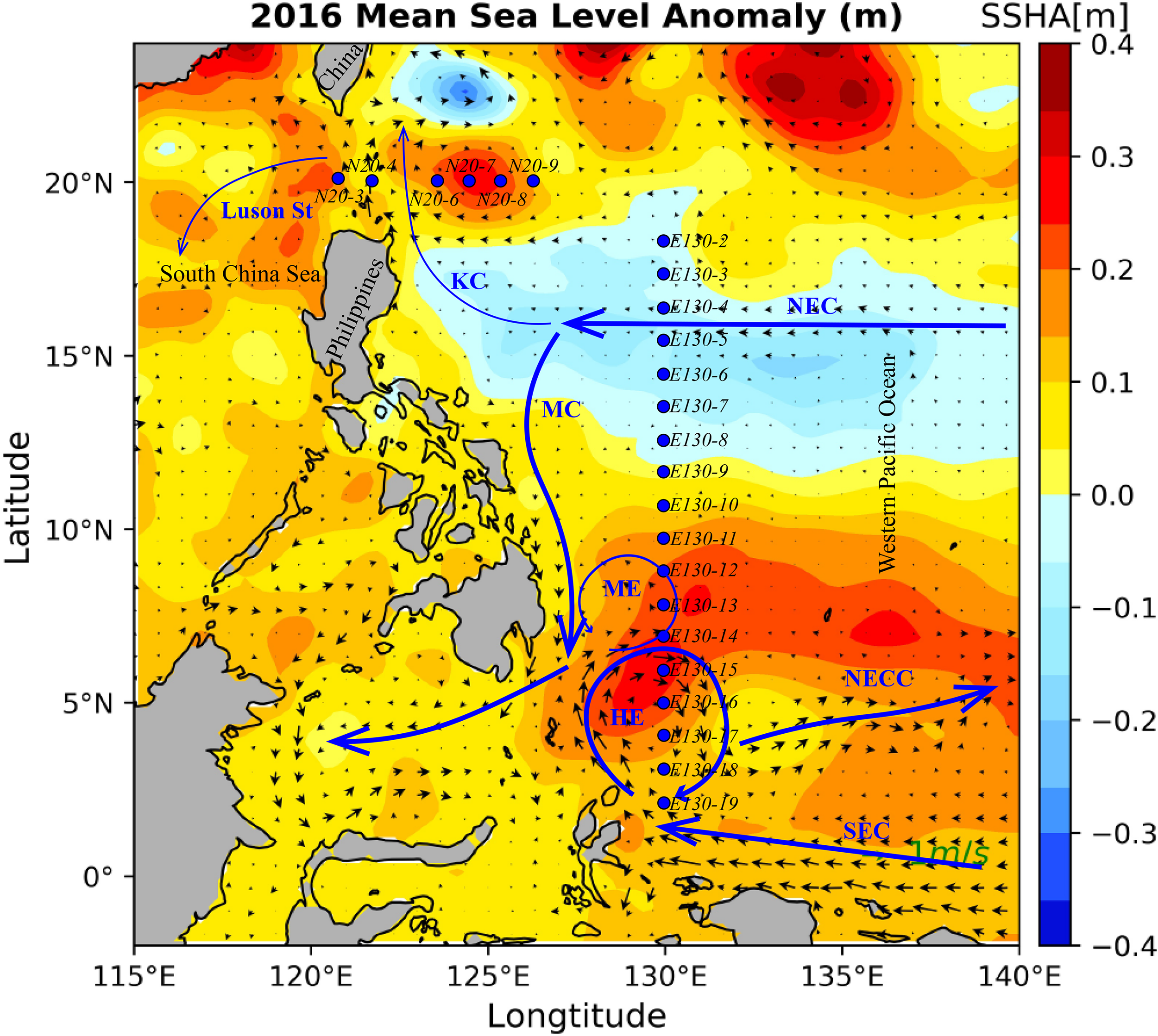 Map of sampling area with major surface currents and eddy system in the western Pacific Ocean (NEC, North Equatorial Current; KC, Kuroshio Current; MC, Mindanao Current; NECC, North Equatorial Counter Current; ME, Mindanao Eddy; HE, Halmahera Eddy). Blue dots are sampling stations and background plots the averaged sea surface height anomaly during the study period in 2016. The locations of eddies were identified using the gridded daily sea surface height anomaly (SSHA) with a spatial resolution of 0.25° acquired from the archiving validation and interpretation of satellite oceanography (https://www.aviso.altimetry.fr/en/home.html).