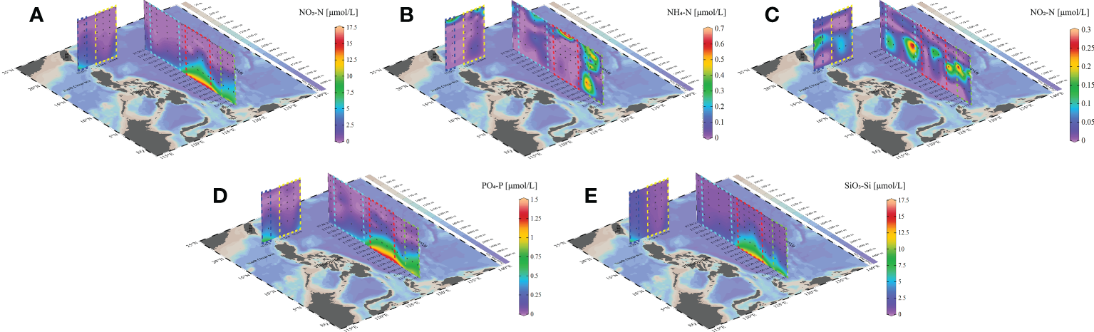 Inorganic Nutrients [NO3-N (A), NH4-N (B), NO2-N (C), PO4-P (D), SiO3-Si (E)] distribution during the sample period in the WPO.