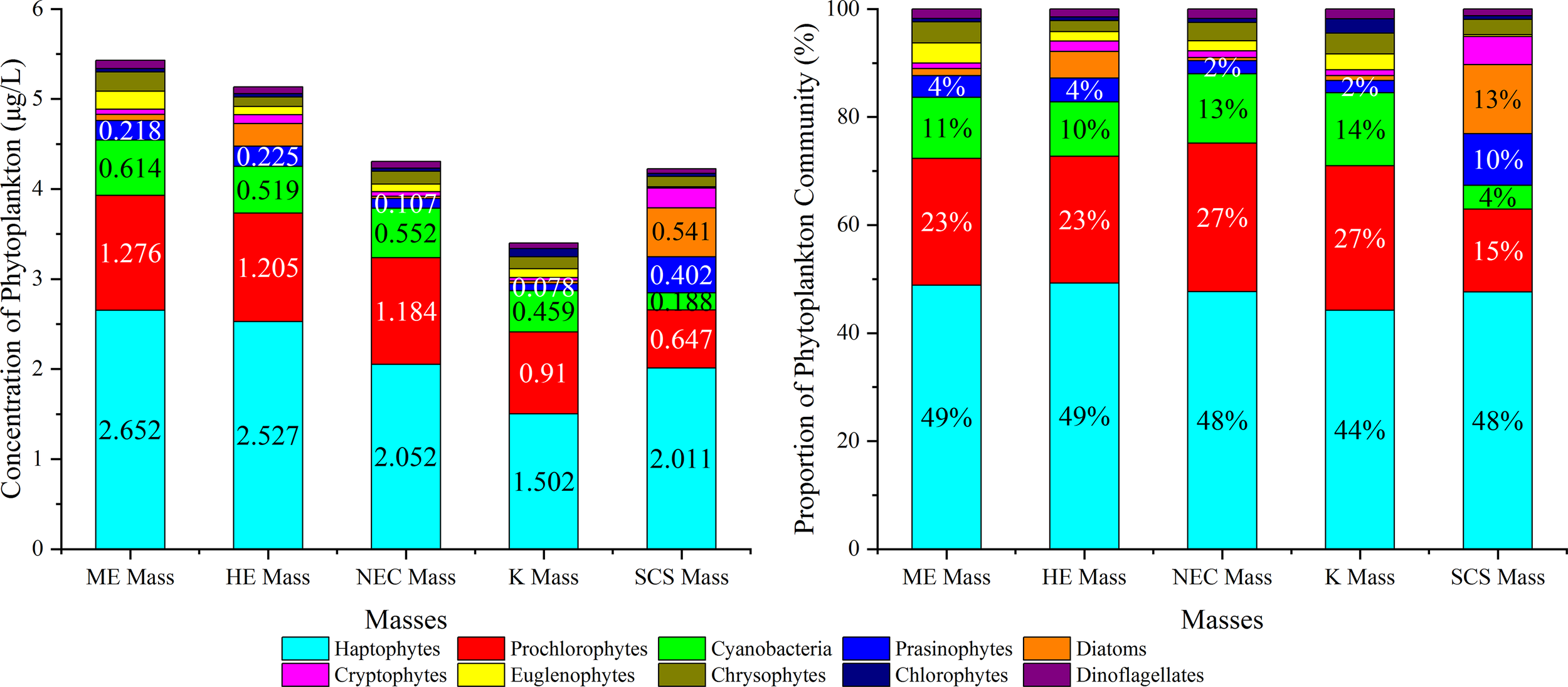 Haptophytes and Prochlorophytes were the primary contributors to the total biomass across all masses, with Cyanobacteria being the third most abundant phytoplankton biomass. However, in the SCS mass, Diatoms and Prochlorophytes accounted for almost the same proportion, and the abundance of Diatoms and Prasinophytes was higher than in other masses. Cryptophytes, Euglenophytes, Chrysophytes, Chlorophytes, and Dinoflagellates comprised less than 5% of the total phytoplankton biomass.