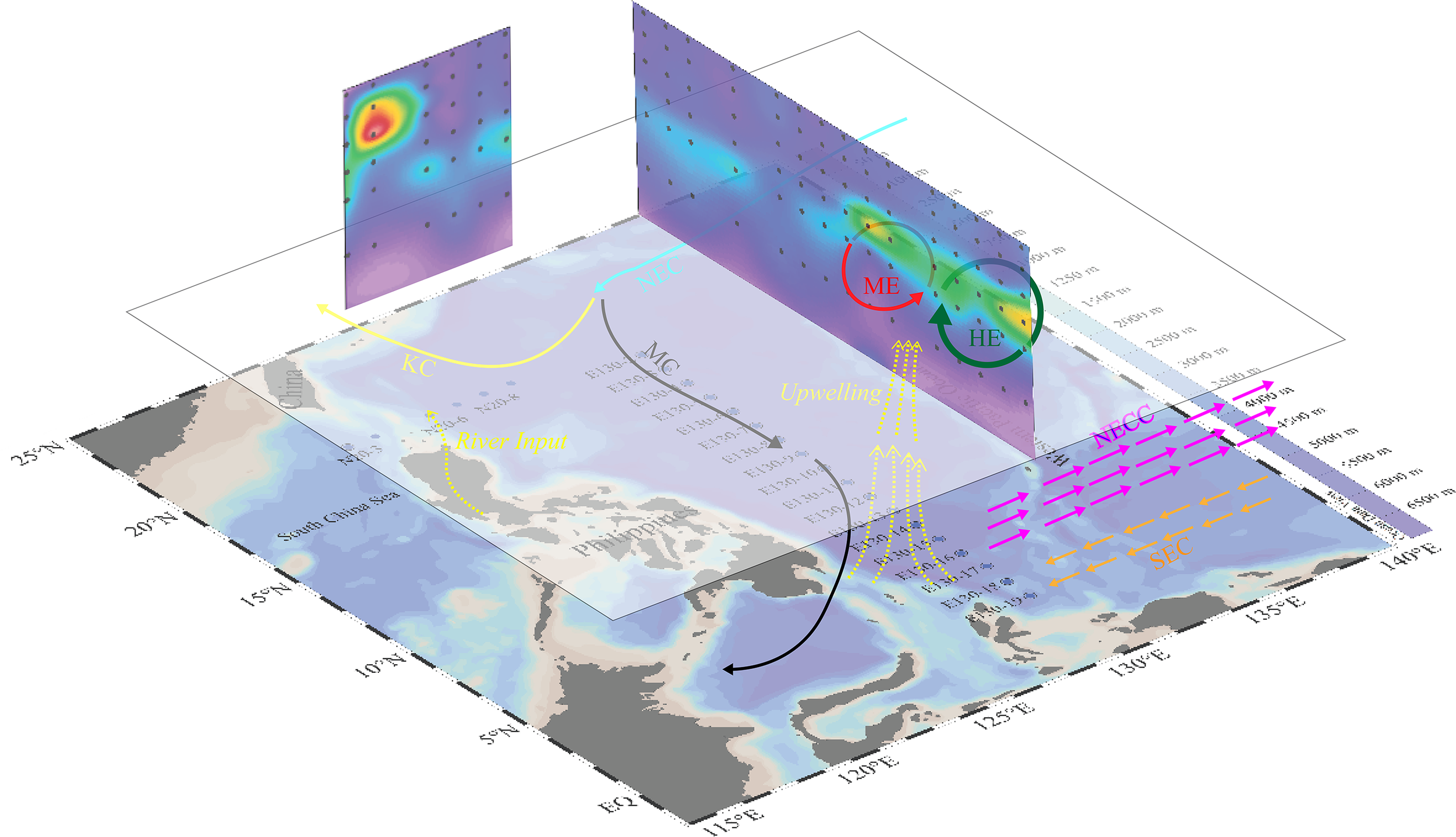 The western Pacific Ocean (WPO) is known for its complex hydrological system and ecosystem, with significant impacts on global climate, ocean circulation, biodiversity, and the atmosphere (Turk-Kubo et al., 2018). Despite its vast area, the WPO is characterized as an oligotrophic sea with low biomass (Ma et al., 2021). Seawater stratification, seafloor topography, atmosphere cycle are among the several factors that can cause oligotrophic characteristics (Zhang et al., 2012). As a complex region, the WPO is affected by numerous ocean eddies and currents. Previous studies have observed massive wind-driven ocean circulation in the WPO (Collins et al., 2010; Yuan et al., 2011), particularly within the western boundary currents, such as Kuroshio Current (KC), Mindanao Current (MC), North Equatorial Current (NEC), North Equatorial Counter Current (NECC), as well as a series of eddies, including Halmahera Eddy (HE) and Mindanao Eddy (ME) (Hu et al., 2015). These eddies and currents can significantly influence nutrient transport, seawater stratification, and anomalous water properties in the WPO. Additionally, Mindanao Dome, a large-scale thermal upwelling dome in the WPO (Masumoto and Yamagata, 1991), provides a stable system for the western boundary current (Suzuki et al., 2005). Monsoons and warm pool can also seasonally influence the sea surface temperature (SST) in the WPO for mass transportation and temperature control (Jia et al., 2018), playing an essential role in the heat budget and global ocean circulation.