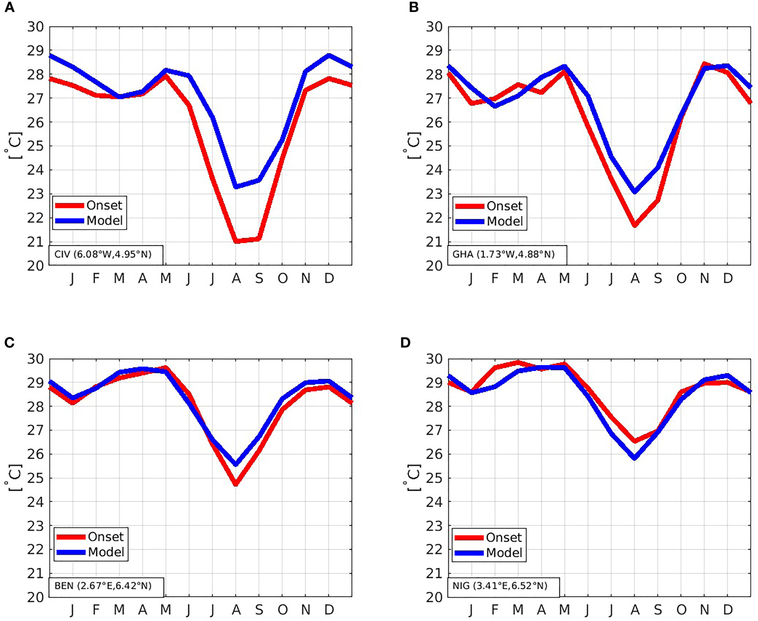 Seasonal cycle of the model SST (in blue) and the ONSET sensors SST (in red) over the period 2008-2012 at PROPAO stations: (A) Côte d’Ivoire; (B) Ghana; (C) Benin; (D) Nigeria.
