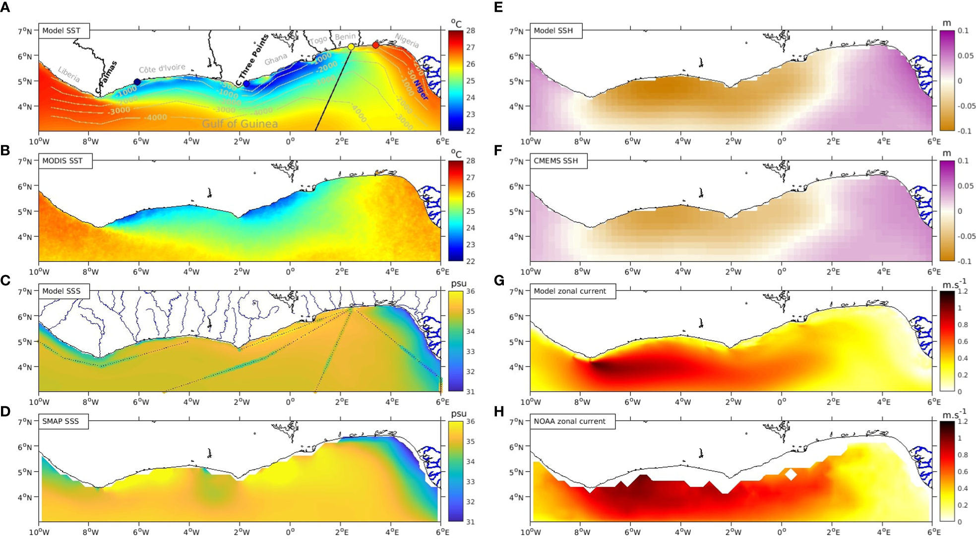 The SSH of the model was also evaluated by comparison with the CMEMS altimetry data (Figures 2E, F). As expected, low SSH between longitudes 7°W and 2°E, is largely associated with cooling in the upwelling area. SSH increases eastward from 2°E with a maximum in the Niger River plume, due to steric variations associated with both temperature and salinity changes (Alory et al., 2021).