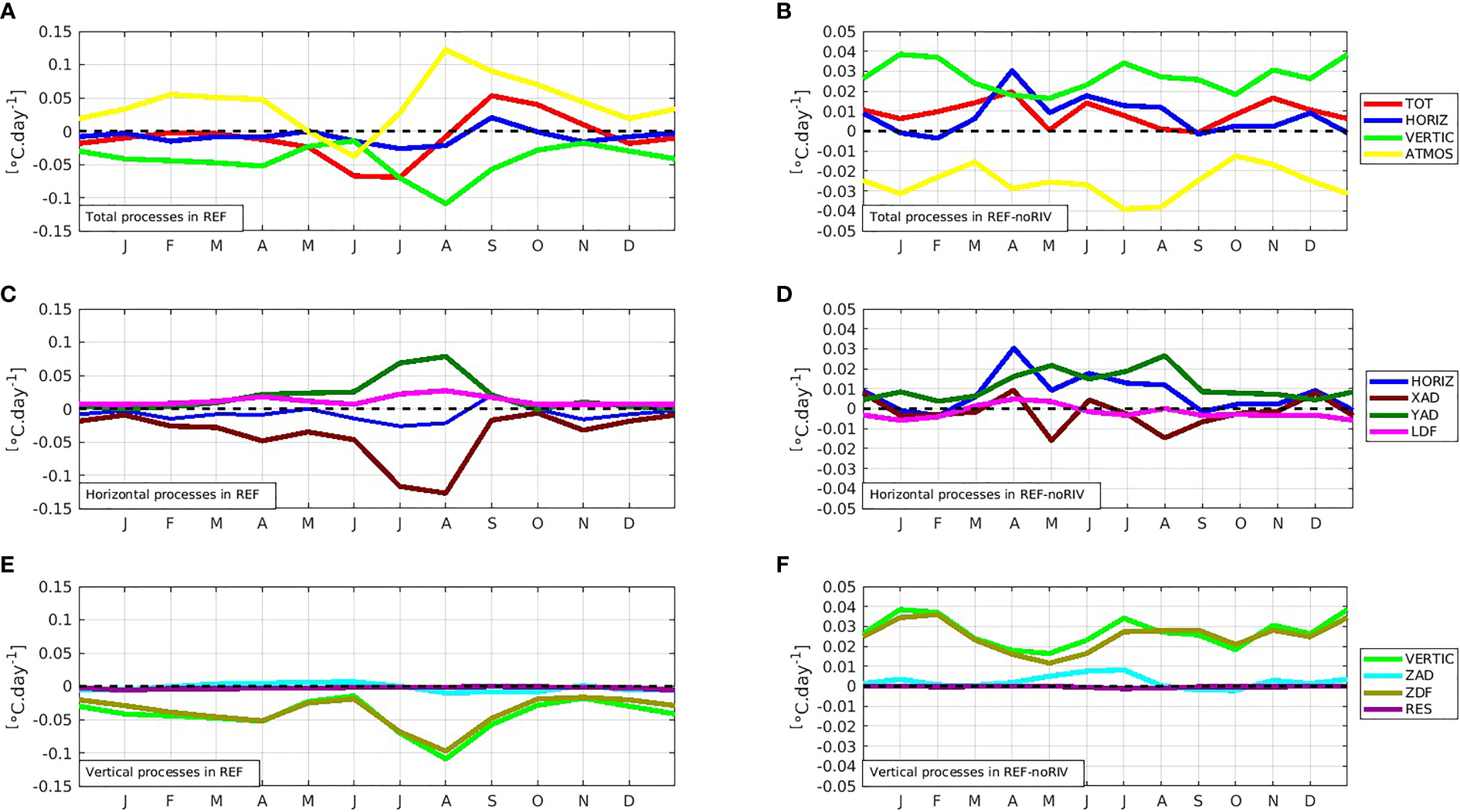 Mean seasonal cycles in REF and REF-noRIV for the period 2010-2017: (A, B) Total processes (TOT) with its components: horizontal processes (HORIZ), vertical processes (VERTIC), atmospheric processes (ATMOS), (C, D) horizontal processes with its components: zonal advection (XAD), meridional advection (YAD), lateral scattering (LDF), (E, F) vertical processes and its components: vertical advection (ZAD), vertical diffusion (ZDF), and entrainment (RES).