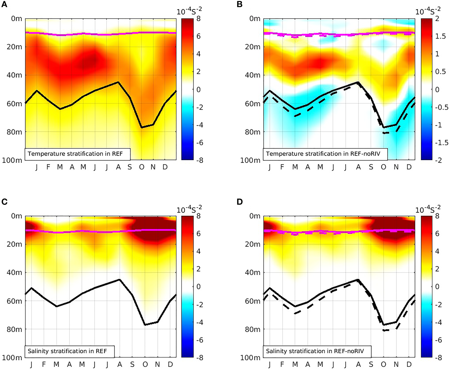 Seasonal cycle of vertical stratification in REF and noRIV for the period 2010-2017: (A, B) temperature stratification, (C, D) salinity stratification. The magenta lines (full line for REF and dashed line for noRIV) represent the depth of the mixed layer. The black lines represent the thermocline.