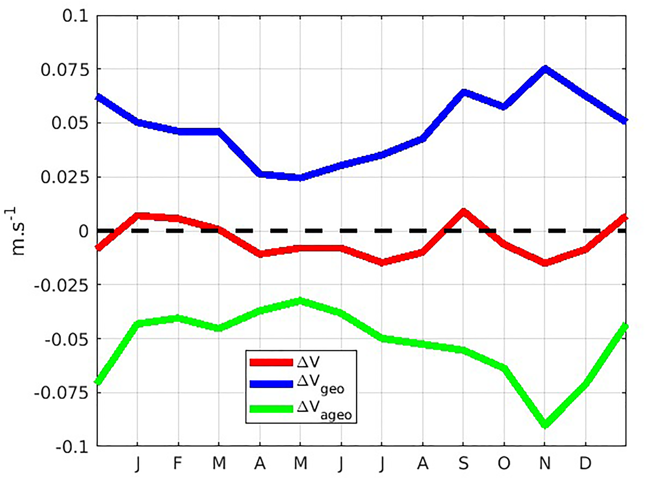 REF-noRIV seasonal variations of the meridional current (red), decomposed into its geostrophic (blue) and Ekman (green) components, for the period 2010-2017.