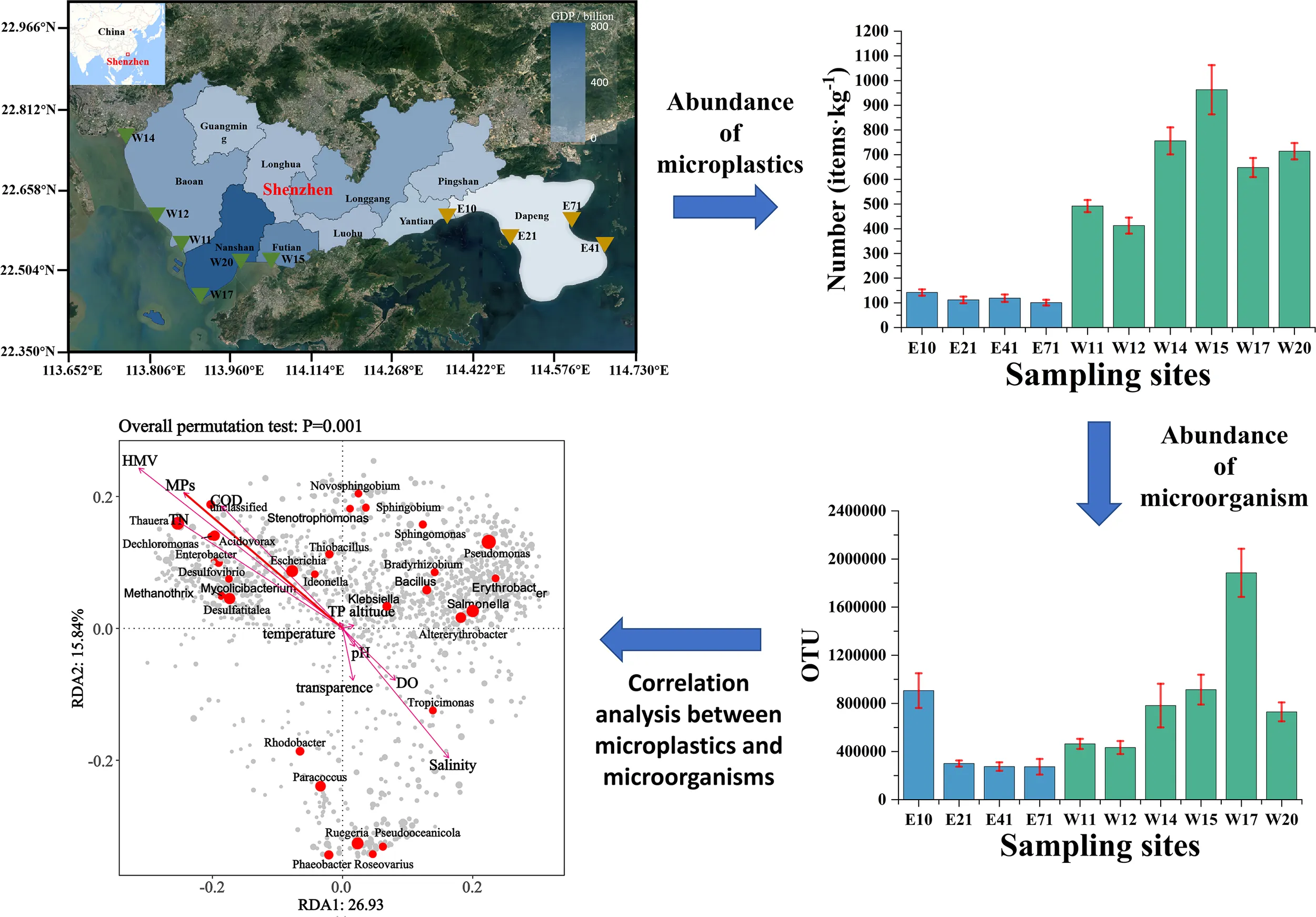 MPs are detected in marine sediments at 10 sites of Shenzhen coastal waters. The concentration of MPs in marine sediments ranges from 101 to 963 items/kg, and is 446 ± 318 items/kg on average. The concentration of MPs in marine sediments of western Shenzhen is much higher than that in eastern Shenzhen, 9.5 times at most. Micro-FTIR analysis shows that the copolymers of PS (39.64%) and PE (16.26%) in Shenzhen coastal waters are the main types of MPs. These potential disparities can be attributed to differences in economic development and population density between the eastern and western parts of Shenzhen. It was obtained through Spearman correlation analysis that the presence of MPs has a great impact on microbial diversity, which further affects the functioning of the microbial community. In conclusion, this study presents a comprehensive investigation of MPs pollution in Shenzhen Coastal Waters, shedding light on the interaction between MPs and microorganisms in the coastal marine environment, providing a valuable basis for future research in this field.