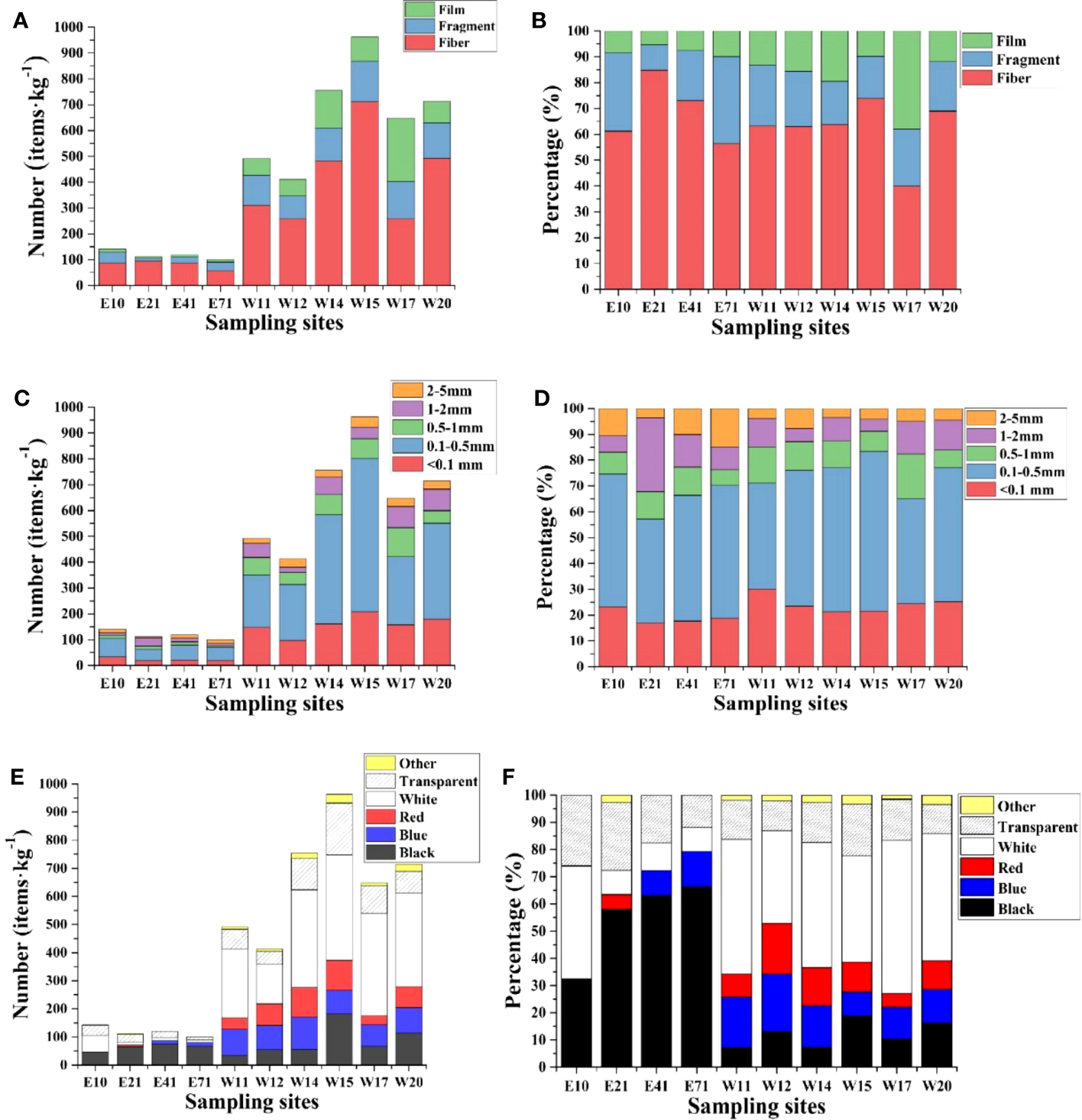 Number and percentage of MPs in different sampling sites, according to shape (A, B), size (C, D), and color (E, F).