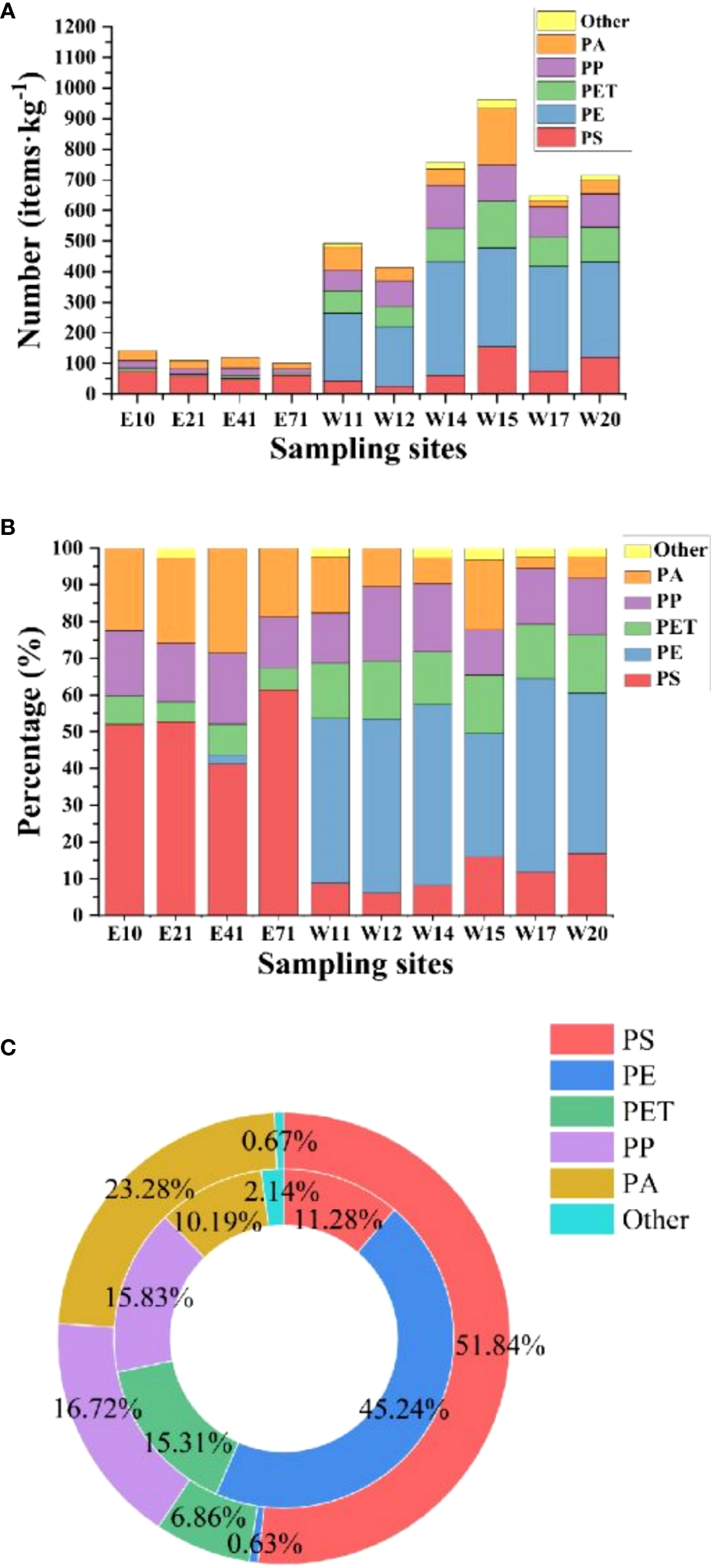 Polymer types of MPs in sediments of the seas around Shenzhen. (A, B) Number and percentage of MPs. (C) Comparison of MPs abundance in eastern and western Shenzhen. The outer circle represents the eastern sample, and the inner circle represents the western sample.