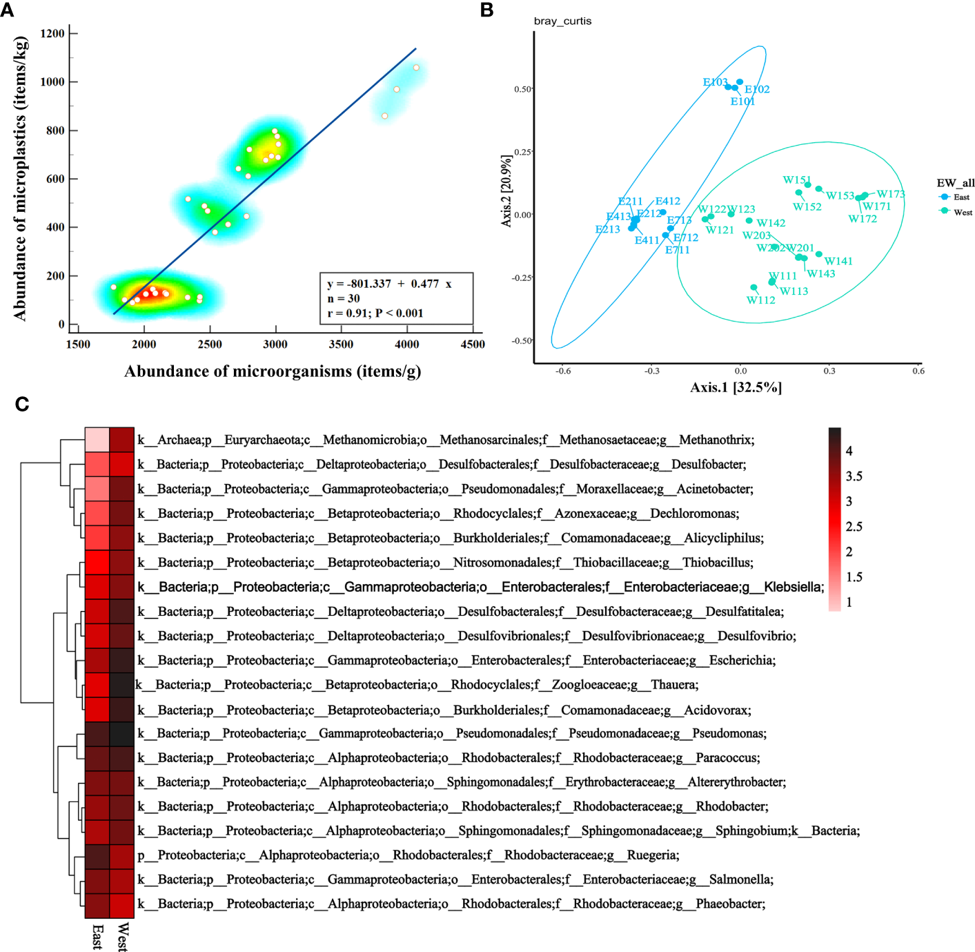 Figure 5A indicates a significant correlation between MPs and microbial community characteristics. The similarity of microbial composition in all samples was analyzed by means of PCoA, and the results showed that samples from eastern sites were obviously separated from those from western sites (Figures 5B, S1). Three duplicate samples from the same site were clustered together, indicating that there was good consistency within this group.