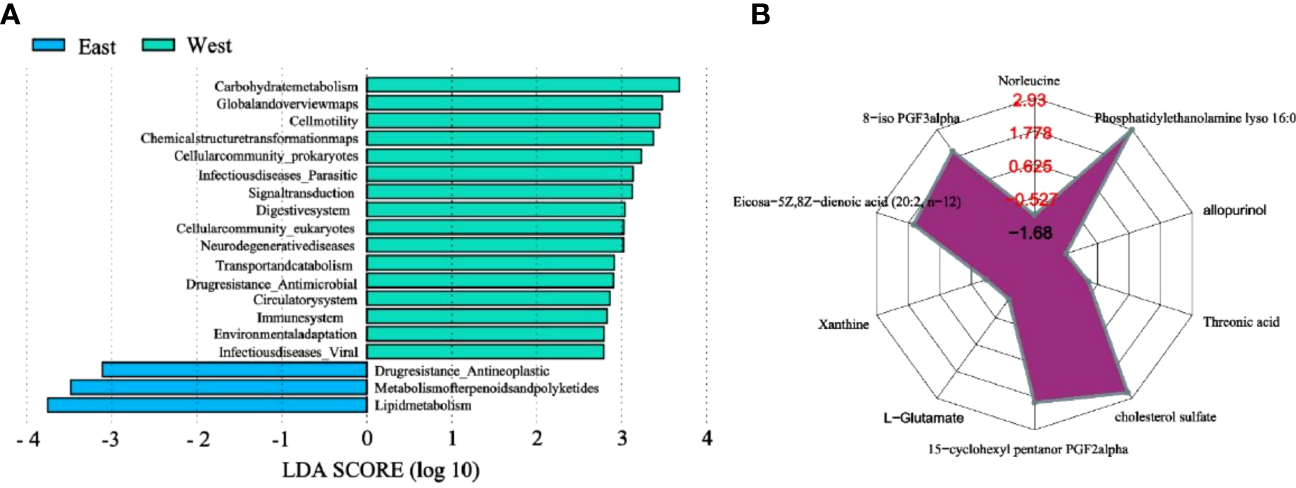(A) LEfSe Analysis of basic Metabolic Pathway of KEGG. (B) Radar map analysis of differential metabolites. For each group of comparisons, we calculate the corresponding ratio for the quantitative values of differential metabolites, and take 2 as the base logarithmic conversion, which is expressed in red font, and each grid line represents a multiple of the difference. Purple shadows are made up of multiple lines of difference for each substance.