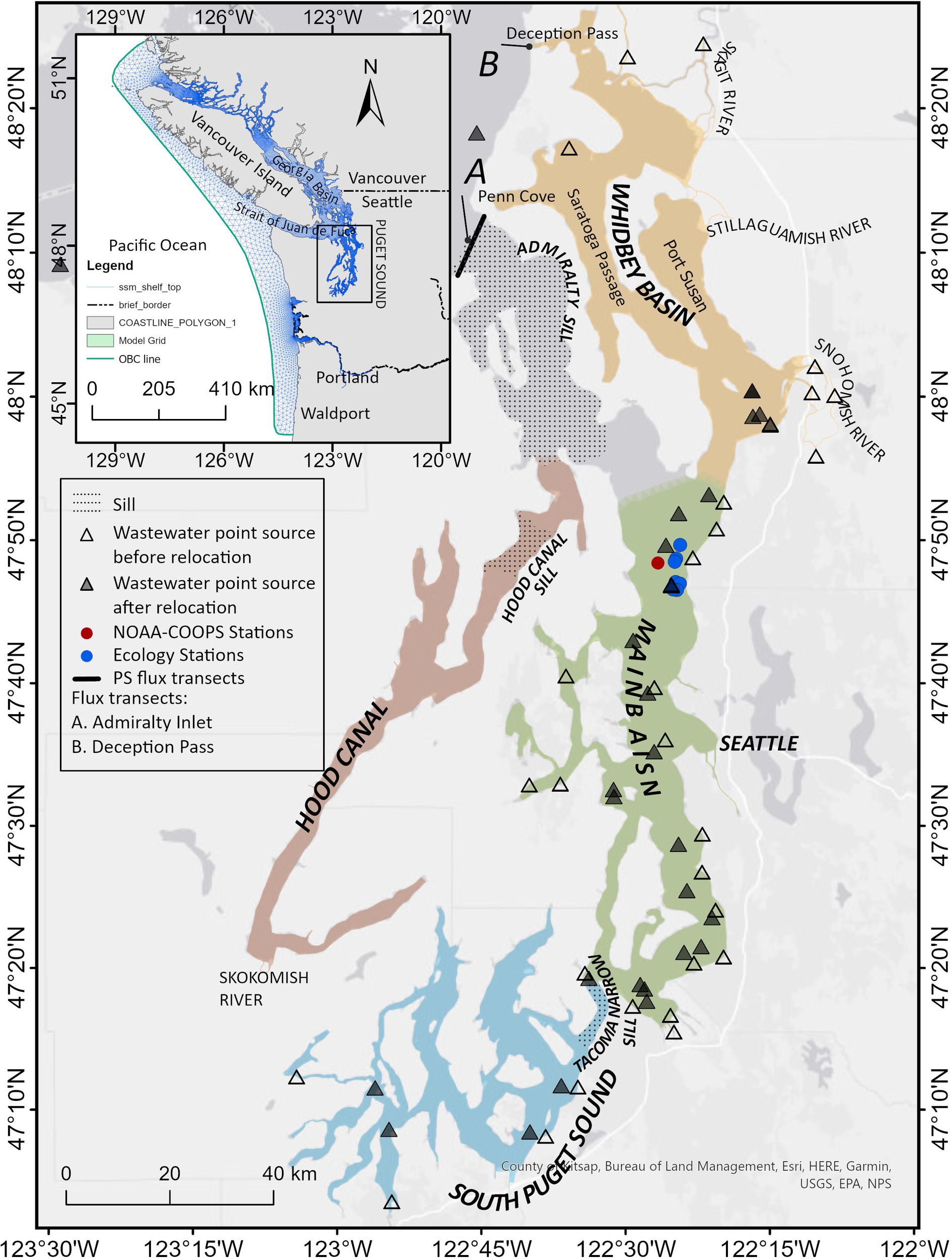 Study area map showing sub-basins within the Puget Sound region of the Salish Sea. The inset shows the entire Salish Sea Model domain. Monitoring data stations indicated include NOAA-COOPS station (red) for currents, Ecology/King County stations for PAR and chlorophyll a data (blue). Transects A and B are locations where volume flux (exchange flow) calculations were conducted. Wastewater point sources (outfalls) are shown as triangles before and after hypothetical relocation. Locations of Tacoma Narrows sill (44 m depth), Admiralty Inlet double sill (64 m and 106 m depths), and Hood Canal Sill (50 m depth) are indicated using dotted pattern fill.