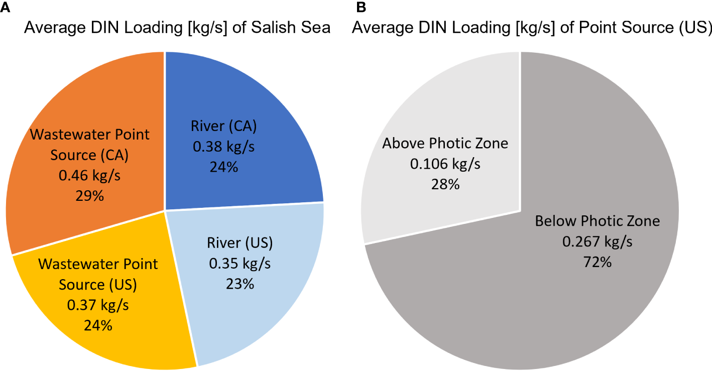 (A) Distribution of average DIN loading [kg/s] for the Salish Sea based on Year 2018, 2019, and 2020 data. The loading values are presented in kg/s, and percentages are relative to the total average DIN loading (1.44kg/s) to the Salish Sea, including Canadian and U.S. regions. (B) Average DIN loading [kg/s] of point sources in the U.S. with percent distribution between above euphotic zone and below euphotic zone.