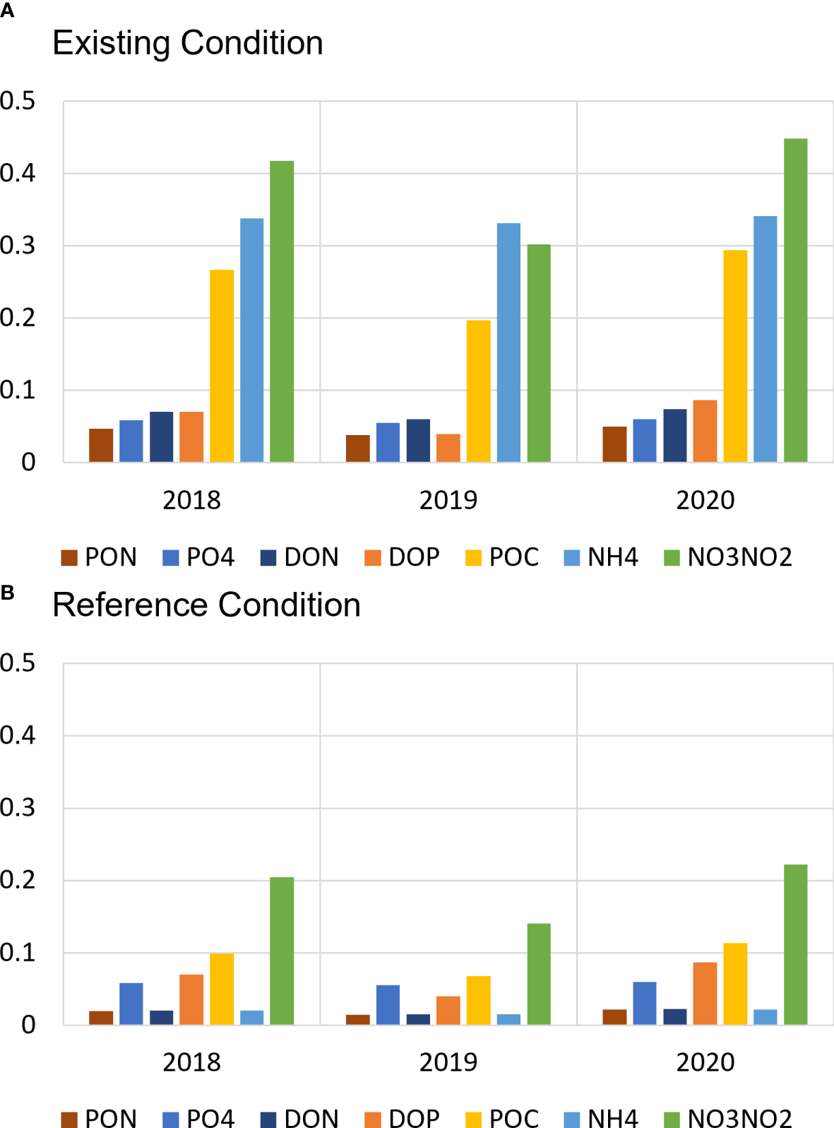Figure 5A provides a comparison of existing nutrient loads to the Salish Sea computed for the years 2018 to 2020 and Figure 5B shows estimated natural nutrient loads for the reference conditions from 2018 to 2020. The Reference condition calculation did not affect phosphate and DOP much but POC, NH4, NO3+NO2, DON, and PON show a significant reduction in nutrient loads in the Reference condition compared to the Existing condition. Based on this approach, over the period 2018 to 2020, 72% of DIN, 73% of DON, and 63% of POC in the total nutrient loads to Puget Sound are estimated to be of anthropogenic origin.