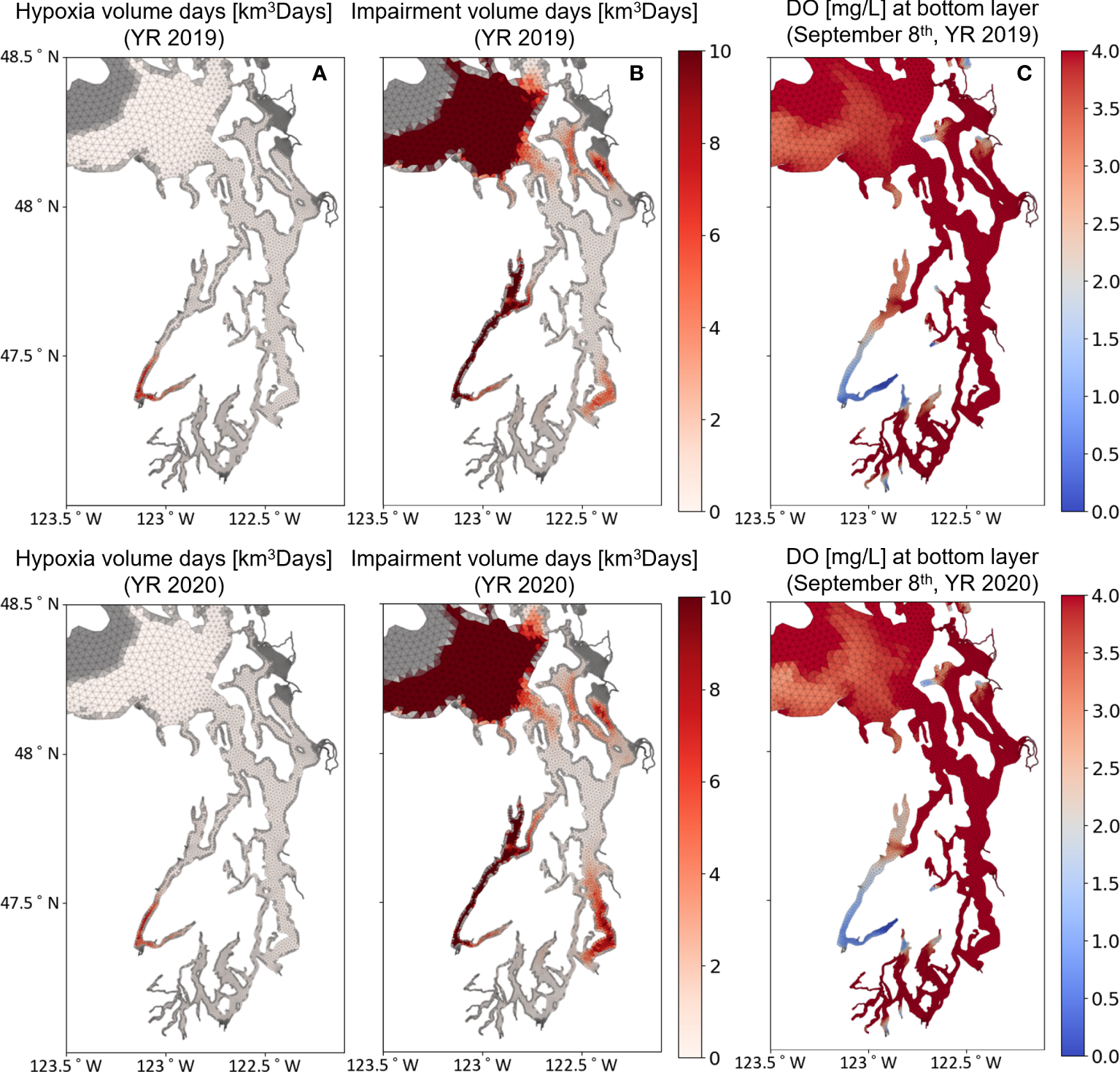 Khangaonkar T. Nugraha A. Xu W. Long W. Bianucci L. Ahmed A. et al . (2018). Analysis of hypoxia and sensitivity to nutrient pollution in salish Sea. J. Geophys. Res. Oceans.123 (7), 4735−4761. doi: 10.1029/2017JC013650