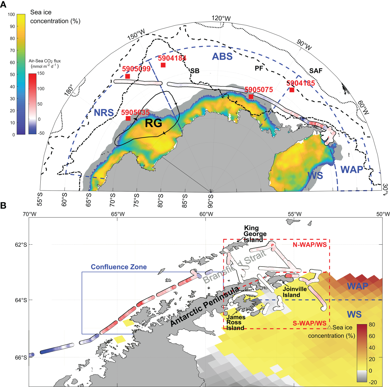 (A) Study regions in the Southern Ocean with sea ice concentrations determined on April 5, 2018 and the air–sea CO2 flux (colors; positive and negative values meaning CO2 source and sink, respectively). (B) Expanded map of the WAP and WS regions (WAP/WS) with changed sea ice concentrations between April 15 and April 30. Colors indicate the sampling date. The red squares in (A) indicate the position of the SOCCOM floats in April 2018. The dotted, dashed, and dash dotted lines represent the Subantarctic Front (SAF), Polar Front (PF), and Southern Boundary (SB) of Antarctic circumpolar current, respectively (Park and Durand, 2019). The colored lines in both figures represent the track of the IBRV ARAON. The blue dashed line in (A, B) represent the local boundaries. RS, AB, WAP, WS imply the Ross Sea, Amundsen–Bellingshausen Sea, Western Antarctic Peninsula, and Weddell Sea, respectively. The gray shading in (A) and the blue and red squares in (B) indicate the marginal sea ice zone, the Confluence Zone, and northern and southern WAP/WS, respectively.