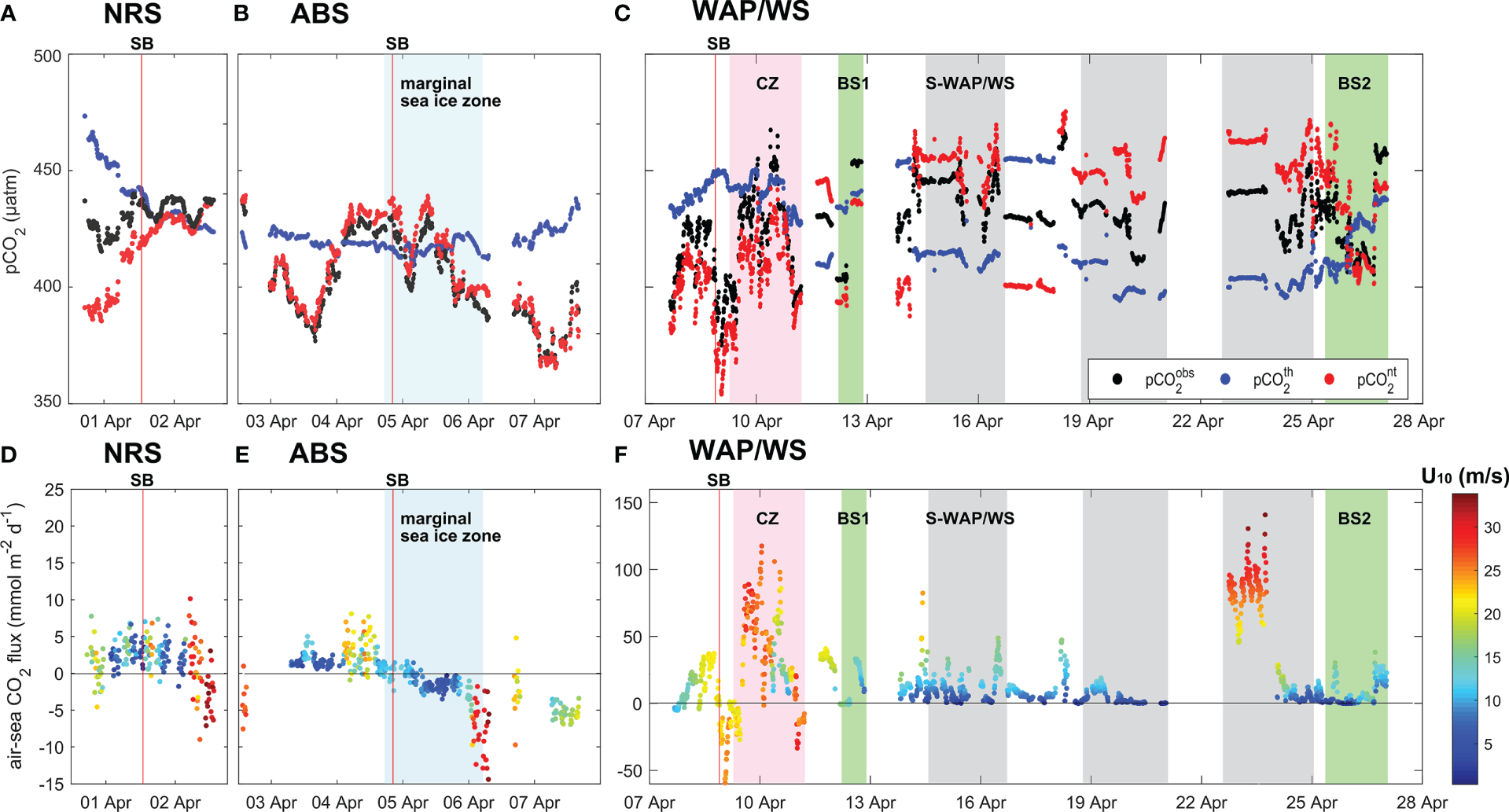 (A–C) Observed pCO2 (; black), thermal pCO2 (; blue), and non-thermal pCO2 (; red) distribution. (D–F) Distribution of the air–sea CO2 flux and wind speed (U10; colors) in the north of Ross Sea (NRS), the Amundsen-Bellingshausen Sea (ABS), and the Western Antarctic Peninsula with the Weddell Sea (WAP/WS). The blue and pink shadings indicate the result in the marginal sea ice zone and Confluence Zone (CZ), respectively. The green shadings show the observations taken twice at different time periods in the Bransfield Strait. And the gray shadings represent the result in the south of WAP/WS (S-WAP/WS). Finally, the red vertical lines indicate the Southern boundary of the Antarctic Circumpolar Current (SB).