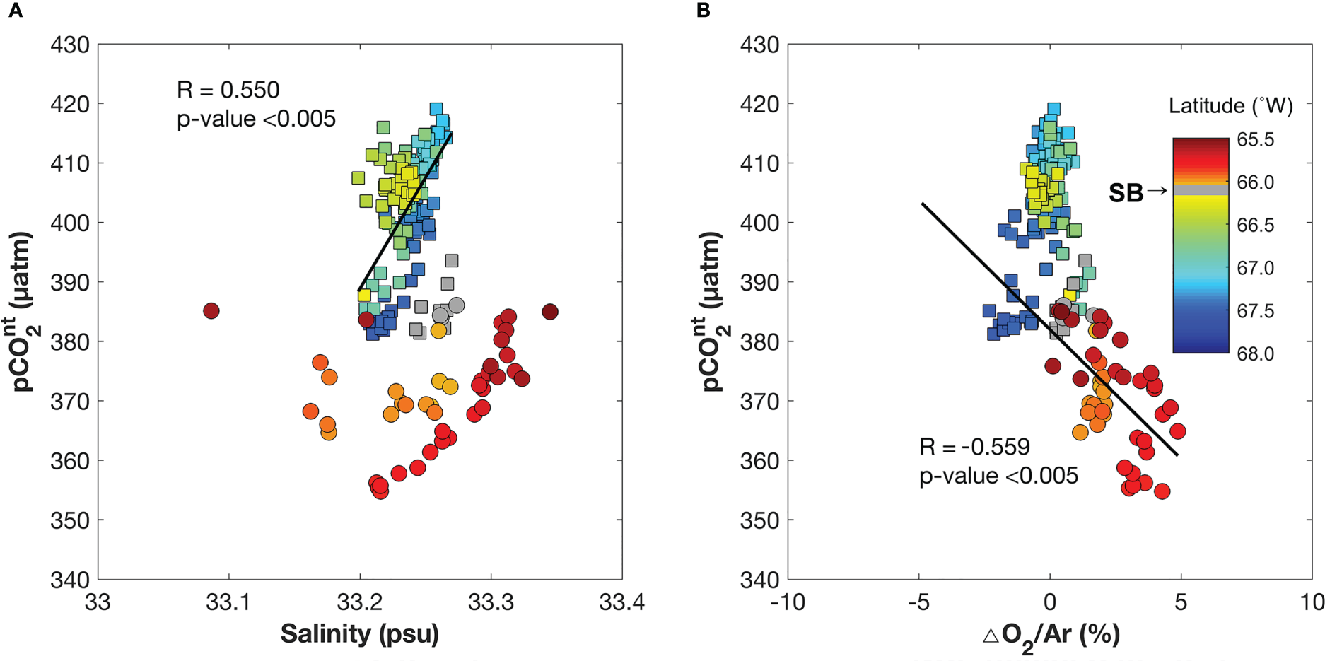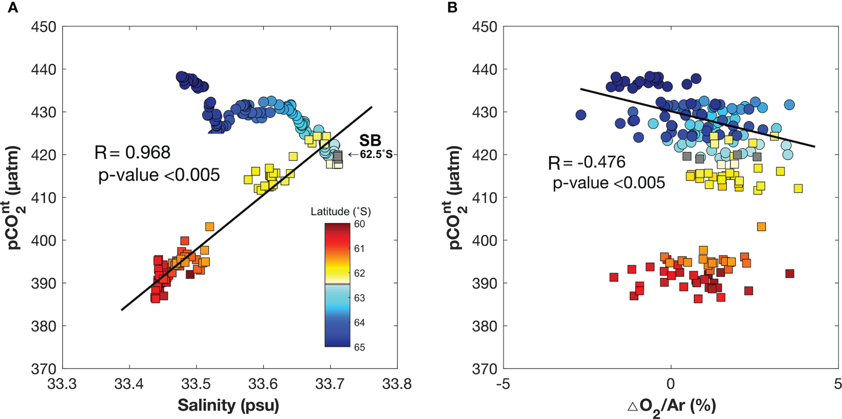 Relationship between the nonthermal component of pCO2 () and (A) salinity and (B) the difference in the gas ratios between oxygen and argon O2/Ar values of the sample and air-saturated water (ΔO2/Ar) (B) in the north of the Ross Sea. The north of the Ross Sea is further divided into northern (i.e.,<62.5°S) (squares) and southern (i.e., >62.5°S) parts (circles) based on the Southern Boundary (SB) of the Antarctic circumpolar current. The colored legends represent the latitude, and the gray color implies the latitude of the SB. The regression lines in (A, B) are determined using the northern and southern part results, respectively.