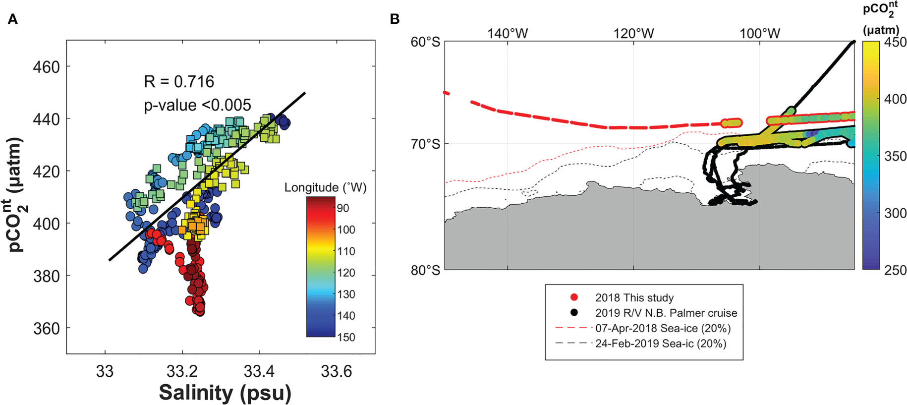 (A) Relationship between and salinity in the ABS with longitude (colors). The ABS is divided into the marginal sea ice zone (i.e., from 100 to 130°W; squares) and an open area (circles). The regression line is determined using the results from 150 to 100°W. (B) Comparison between the distribution of non-thermal pCO2 ( ) obtained in this study (red solid line) and those reported in previous studies (black solid line) in the Amundsen-Bellingshausen Sea. The dashed lines in (B) indicate the sea ice edge determined in 2018 (red) and 2019 (black).