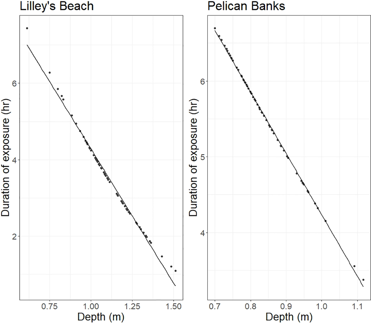 The depth and exposure categories differed between the two sites and between years at the fixed transects (Supplementary Figure 1). Lilley’s Beach exhibited a relatively wide depth range along the transects, varying from 0.61-1.39 m in 2020 to 0.79-1.51 m in 2021 (Supplementary Figure 1). In contrast, Pelican Banks showed a narrower depth range, ranging from 0.72-1.13 m in 2020 to 0.69 – 0.98 m in 2021. Depth and exposure duration were highly correlated, and the above depth categories received 1-8 hours of exposure during low tides (Figure 1).