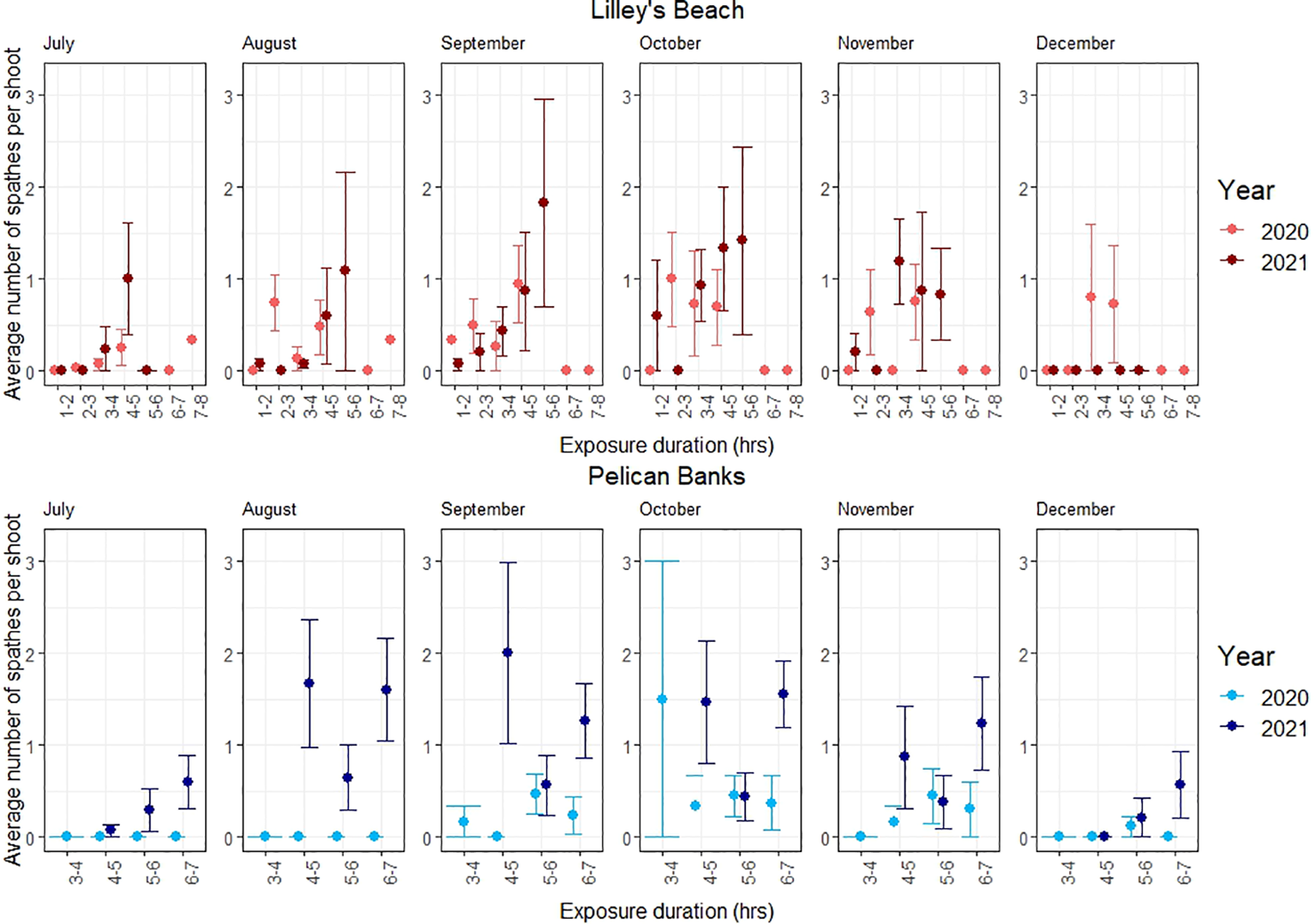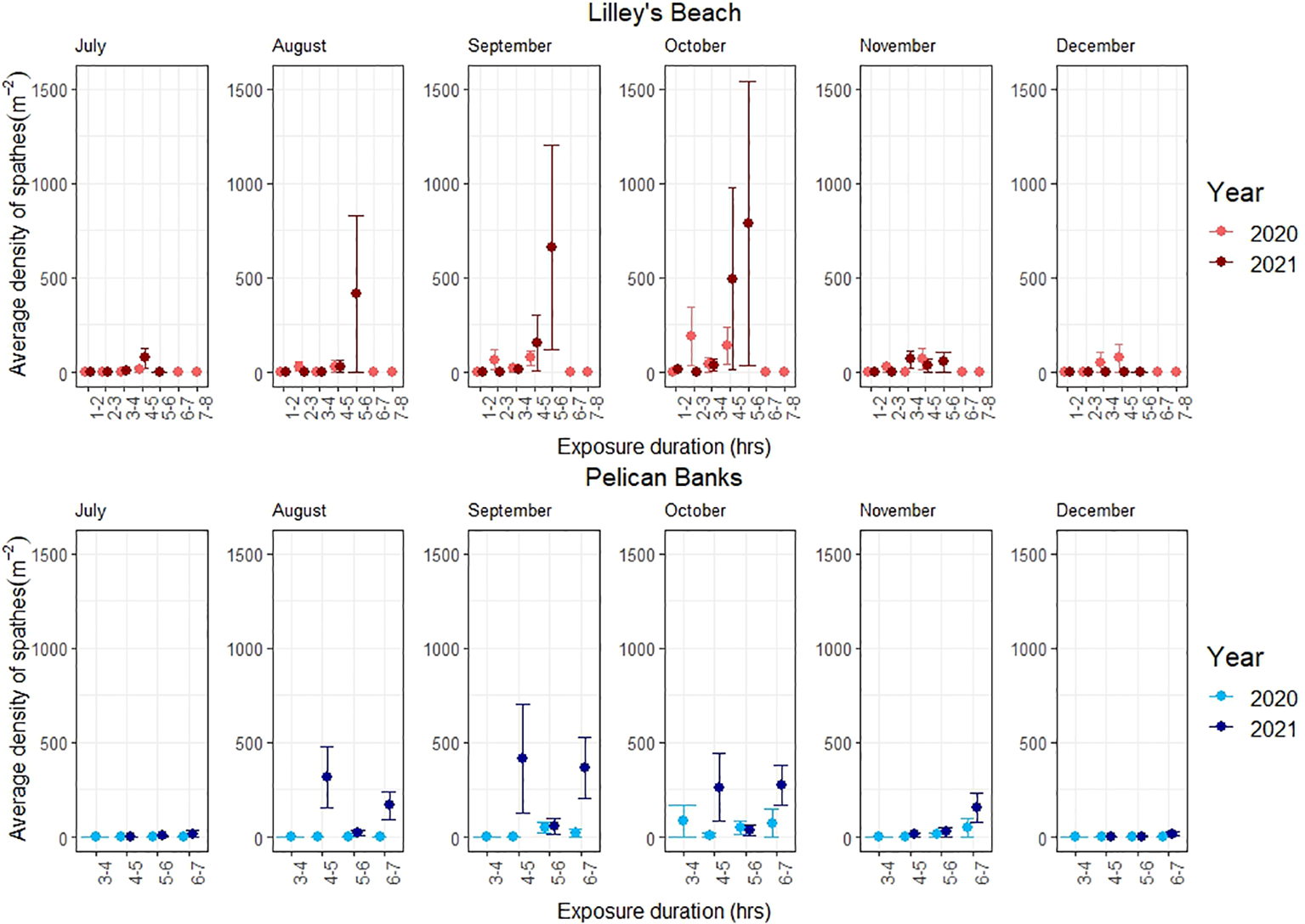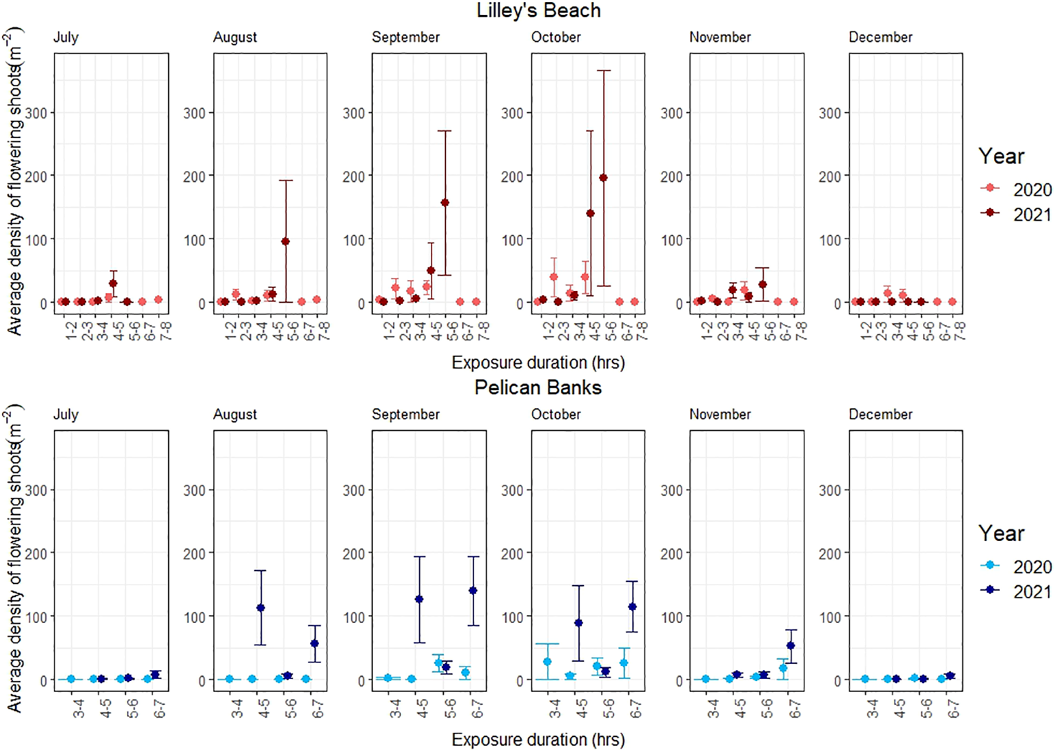 Additionally, the density of spathes was significantly different among exposure categories in Lilley’s Beach during the peak flowering months (F123, 7 = 3.324, p<0.01), where the difference was noted between 3-4 hrs and 5-6 hrs exposure categories in 2021 (post-hoc test, Table 2). The effect of the exposure duration was not prominent at the Pelican Banks site; however, a significant difference in spathe density resulted between 5-6 hrs and 6-7 hrs exposure categories in 2021 (Post-hoc test, Table 2). The depth gradient of this site was not as wide as Lilley’s Beach (Supplementary Figure 1). Significant inter-annual variation was observed only in Pelican Banks (F120, 1 = 10.801, p<0.01, Table 2) while the difference was noted between the same exposure categories (i.e., 5-6 hrs (2020) and 6-7 hrs (2021)) between years (Post-hoc test, Table 2).