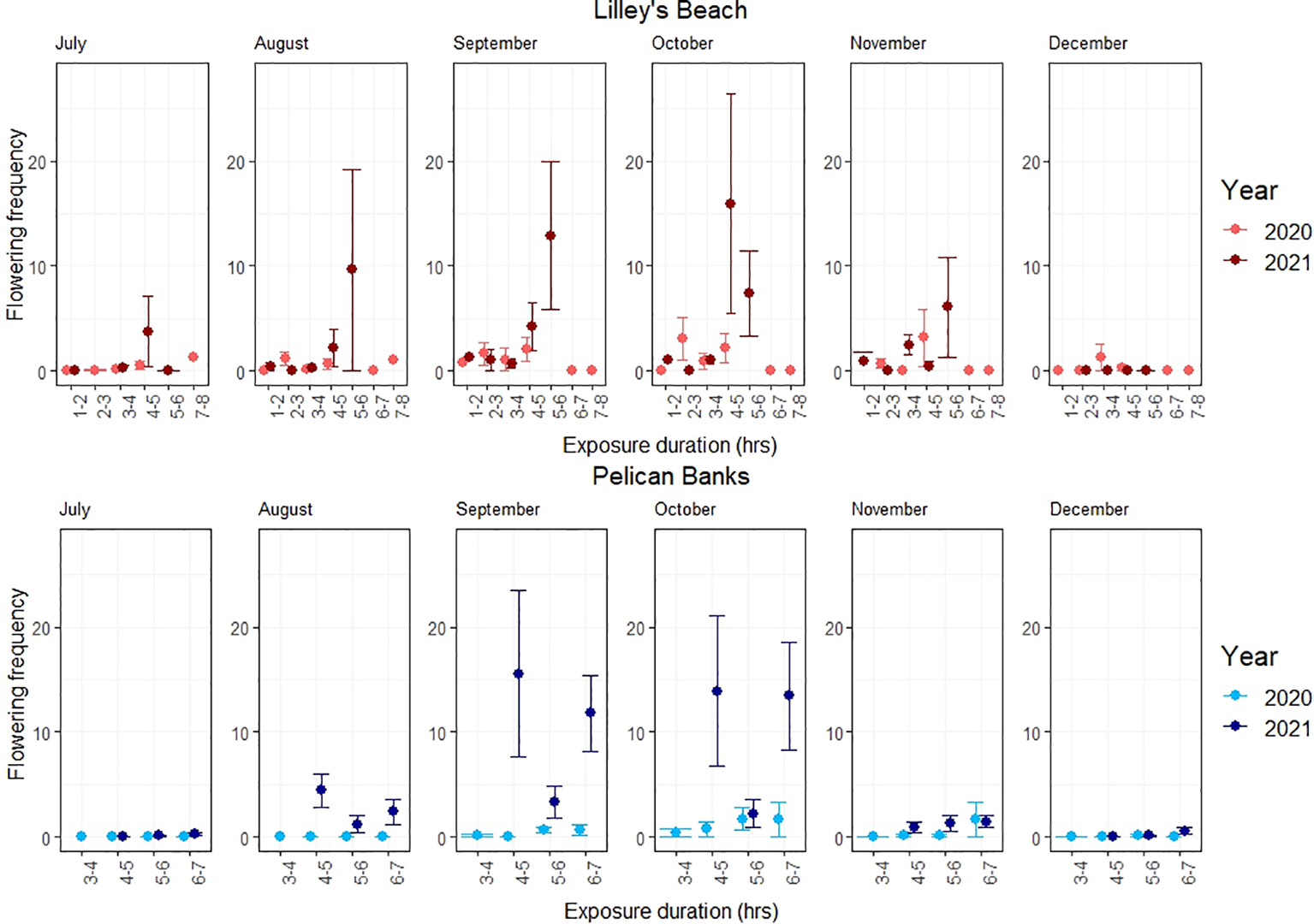 The peak flowering was observed in September-October across most of the exposure categories in both sites (Figure 3). All flowering metrics showed a large variation between the two years, with a notable interannual variability noted only in Pelican Banks site (F120, 1 = 10.801, p<0.01, Table 2). Lilley’s Beach had a comparatively higher density of flowering shoots and spathe density than Pelican Banks, with the mean density of flowering shoots and spathe density reaching more than 196 m-2 and 600 m-2 during peak flowering months, respectively (Figures 2, 3). The frequency of flowering was relatively higher in most of the exposure categories in Lilley’s Beach than at the Pelican Banks over the flowering season (Figure 4).