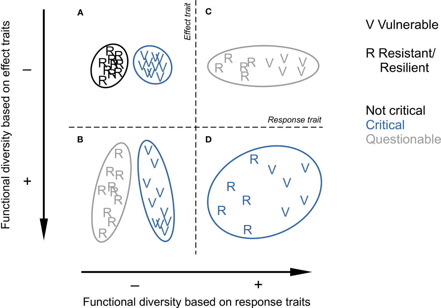 Conceptual confrontation of benthic functional diversities derived from response traits (horizontally) and effect traits (vertically). From (A-D), each panel represents one (C, D) or two (A, B) species (letters) communities in a space defined by a synthetic response trait separating resistant or resilient life strategies (R) from vulnerable (V) ones (horizontally) and a synthetic effect trait positioning species according to their ecosystem functions (vertically). What matters is that the surface area (ellipse size) of the community represents the extent of functional diversity from a species dissimilarity point of view. Colours indicate if species removal following disturbance could be critical for ecosystem functioning. The figure questions where research efforts should be put from a perspective of ecosystem functioning preservation. Note that these variations are independent of species richness (10 species in every case), as underlined by Cadotte et al. (2011).