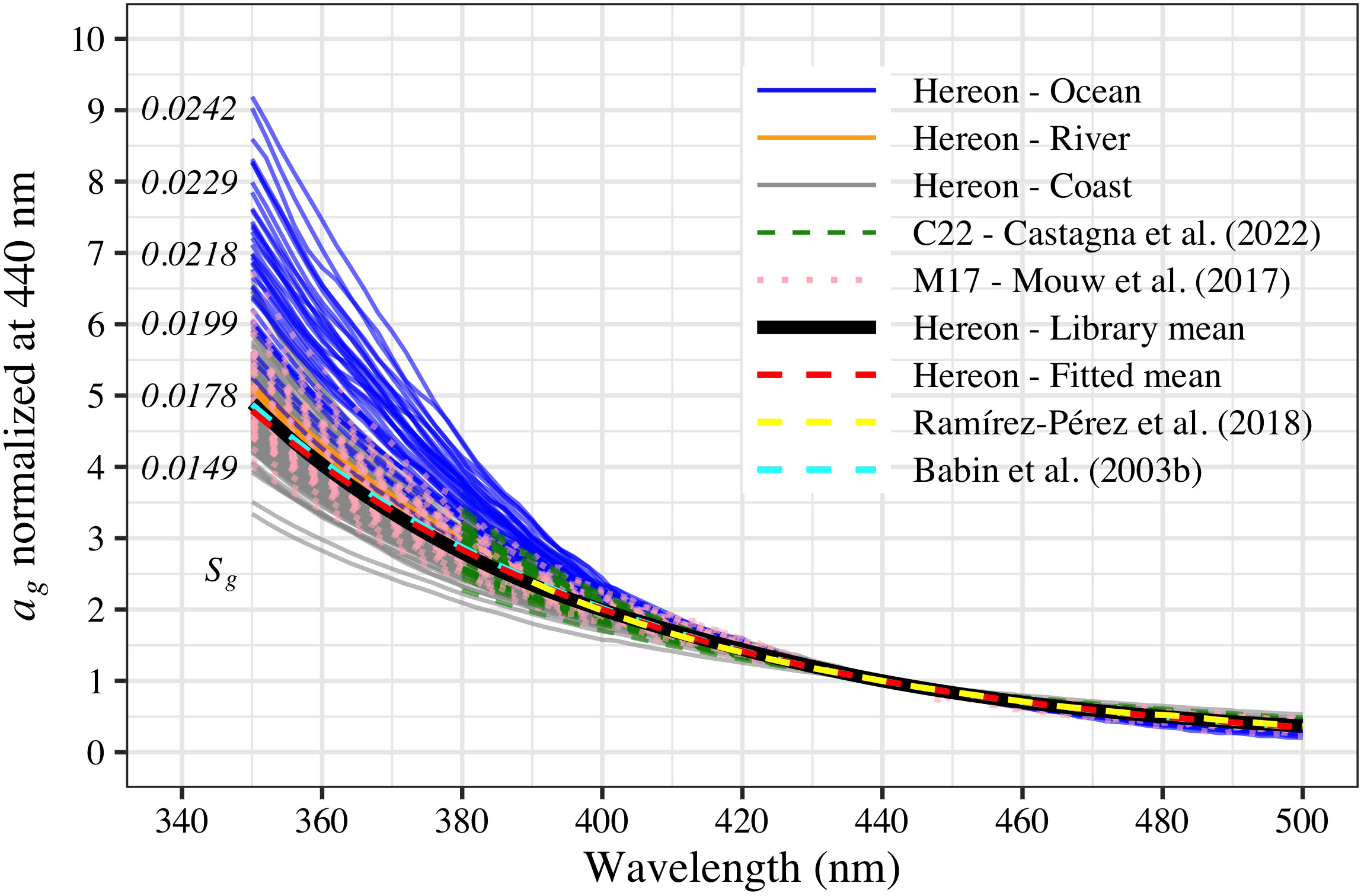 The main focus of building an IOP model is on the absolute values and spectral shapes (mostly from the ultra-violet to the near-infrared range) of the IOPs of individual components. The absolute values of the IOP components are related to their concentrations, and are typically described using mass-specific IOP coefficients. The spectral shape of mass-specific IOP is not dependent on the component concentrations in the water, and is instead a property of the component itself, determined by its biological, physical, and chemical properties. Some component IOP spectra are relatively simple, such as the absorption coefficient of CDOM, (where the subscript g stands for the methodologically more appropriate term gelbstoff), which exhibits a monotonically decreasing trend with wavelength, and can be well approximated by an exponential function in a certain wavelength range. Some are more complex, such as the absorption coefficient of phytoplankton, , which has a large peak in the blue-green spectral range and a narrower peak in the red spectral range. In larger absorbing phytoplankton particles, spectral scattering measurements (Bricaud et al., 1983; Roesler and Boss, 2003; Zhou et al., 2012) or simulations (Bernard et al., 2009; Organelli et al., 2018; Robertson Lain and Bernard, 2018) tend to show more peak-valley features. The feature is primarily due to the suppressions within absorption bands, which probably causes the inapplicability of assuming the scattering spectrum as a smooth power-law function (Babin et al., 2003a).