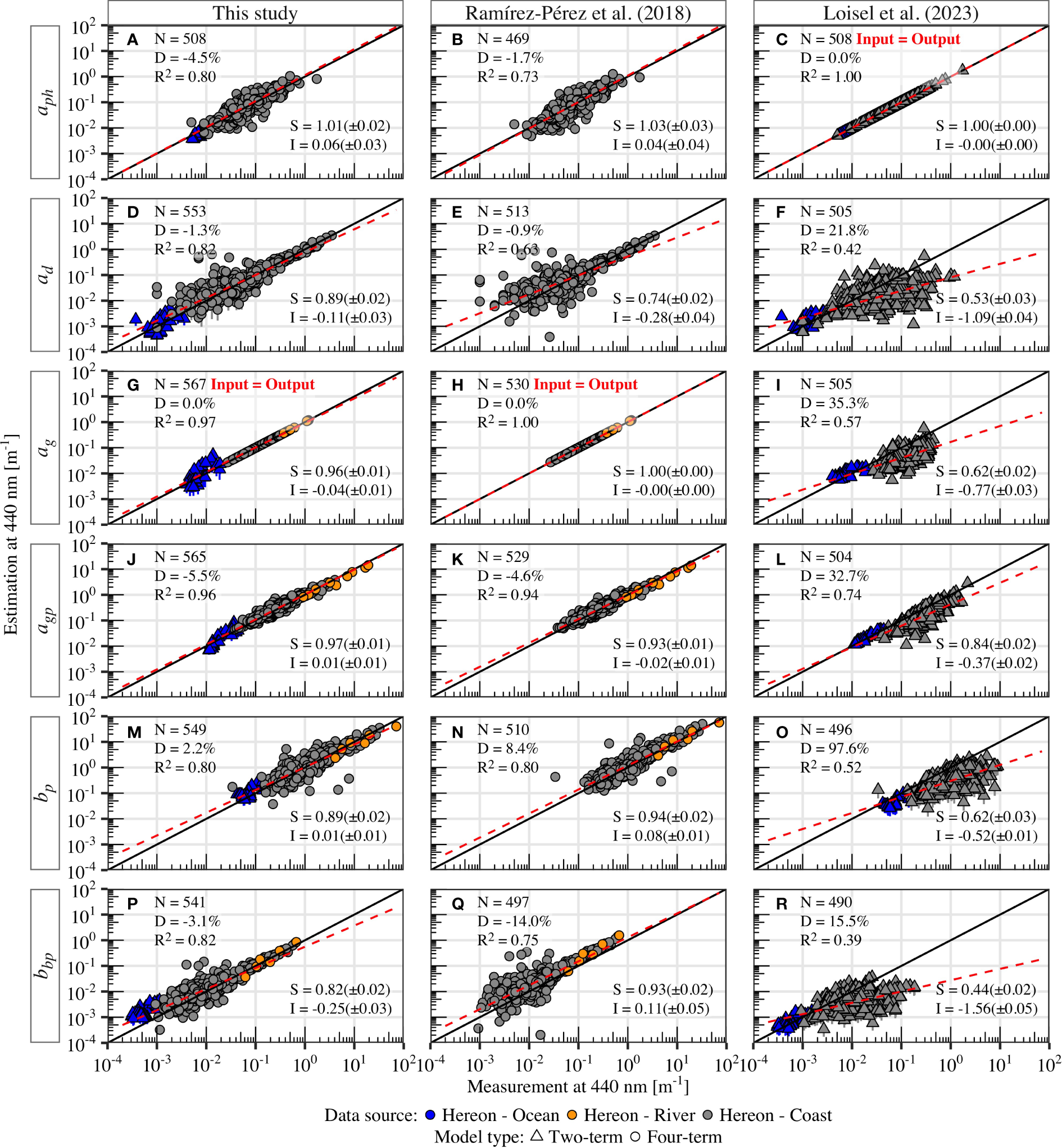 Component IOPs of Case-2 waters are usually treated separately, which is commonly referred to as a “Four-term” model (IOCCG, 2006 and references therein), including the four components pure water, CDOM, detritus, and phytoplankton as the four important components. However, one should note that, as per Case-2 definition, there are certainly other sources of IOPs, e.g., air bubbles (Stramski and Tegowski, 2001) or zooplankton (Basedow et al., 2019), which, however, are out of scope in this study (but any other components can be added easily to our model). The number “Four” here should be regarded as a “manageable number” as discussed in Stramski et al. (2001), which is a general concept of IOP assembly, and each component can be further separated into subcomponents based on how modelers understand the bio-geo-optical progress (Stramski et al., 2001, 2004). IOPs of pure water are typically parameterized as a function of wavelength, temperature, and salinity (Röttgers et al., 2016). The magnitude and spectral slope of CDOM vary significantly with molecular weight, source, and status of photobleaching of the relevant absorbing molecules (Röttgers and Doerffer, 2007; Helms et al., 2008), with the slope values usually present a lower variability in Case-2 waters (Babin et al., 2003b). Detritus refers to the non-living organic and inorganic matter in the water column. It can be challenging to differentiate between biogenic (from living organisms) and non-biogenic (minerogenic, from rocks and minerals) detritus due to their similar spectral shapes and non-additive properties (Stramski et al., 2001; Roesler and Boss, 2008; Röttgers et al., 2014a). However, by incorporating their individual concentrations in a forward bio-optical model, it is possible to understand their respective impacts on particulate IOPs across various water environments (Ramírez-Pérez et al., 2018; Lo Prejato et al., 2020). In Case-1 waters, it is reasonable to assume that detritus IOPs are more related to phytoplankton biomass due to its degradation, whereas in hydro-dynamically mixed shallow waters, they are more related to inorganic suspended matter concentrations. Phytoplankton IOPs show significant variability, with different phytoplankton groups exhibiting different spectral attributes (Bricaud et al., 1983; Sathyendranath et al., 1987; Hoepffner and Sathyendranath, 1991; Bracher et al., 2017). This variability can be attributed to the diversity of phytoplankton groups and species and their varying pigmentation, structural and morphological characteristics, which affect their light-interacting properties. This highlights the importance of considering the phytoplankton community composition when modeling IOPs and interpreting the results.