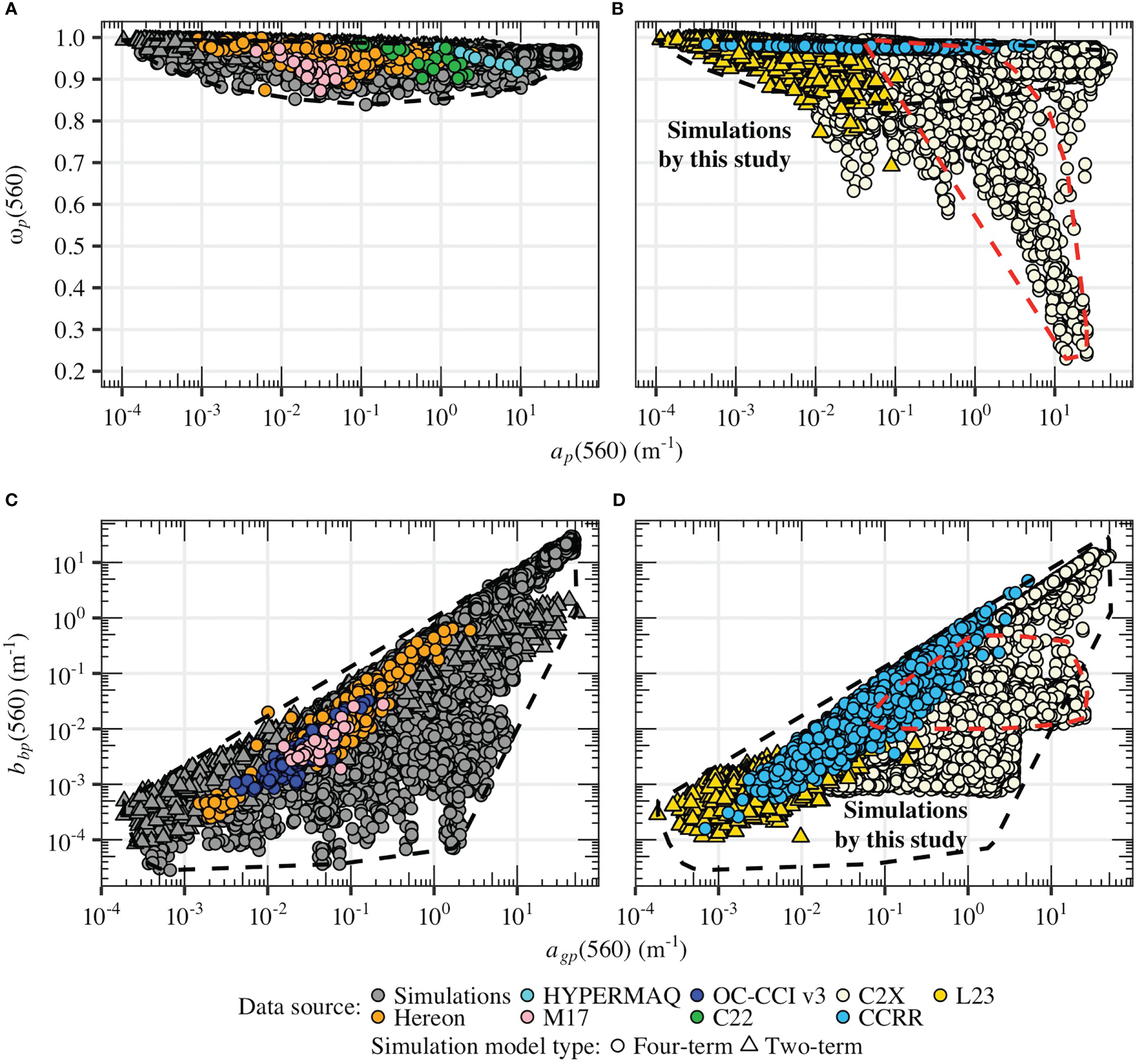 In satellite remote sensing of waters, there are many influencing factors, which produce partly similar features in the top-of-atmosphere radiance signal; these include the solar and observational angles, from the atmosphere especially the Rayleigh scattering from air molecules and aerosol influences, reflection effects at the water surface, and in the water column the IOPs of the different components. This can lead to ambiguities in the signal. Thus, accurate IOP modeling is important for the development of water algorithms, but also as a basis for atmospheric correction models. It allows the construction of large synthetic data sets without in situ measurements with unpredictable errors and possible data gaps (IOCCG, 2006). This is particularly important for the training of neural networks, which are used for about two decades for the inversion of remote sensing reflectance into IOPs, especially to solve the ambiguities for optically complex waters (Schiller and Doerffer, 1999; Doerffer and Schiller, 2000). However, due to simplification of bio-geo-optical properties, the simulations were based on several limiting assumptions and oversimplifications (Schiller and Doerffer, 1999; Doerffer and Schiller, 2007). To address these limitations, Hieronymi et al. (2017) developed an optical water type (OWT) classification and used a set of OWT-specific neural networks for a much wider range of applications including extremely absorbing or scattering waters; in addition, different phytoplankton groups were considered, but still with lacked confidence in the phytoplankton scattering coefficient due to the lack of observations. Note that it is important to consider phytoplankton community distribution in the forward modeling, since the phytoplankton diversity can result in varying cell sizes and pigment compositions, making the standard ocean color algorithm inapplicable across different water environments (Szeto et al., 2011; Bracher et al., 2017; IOCCG, 2019). For instance, coccolithophores exhibit IOPs and [Chl] that significantly differ from other types of algae, leading to distortion in the spectral band ratio (IOCCG, 2014). Detection of coccolithophores is often challenging, as they are usually only flagged when their brightness exceeds a certain threshold (Balch and Mitchell, 2023). To extend the dilemma further: in Case-2 waters, the relationships between water components are more intricate and often random (Woźniak and Dera, 2007). Thus, despite numerous in situ measurements since decades, a universal approach for all natural waters remains elusive (IOCCG, 2019). Hence, a radiative transfer modeling framework specific to algorithm development, such as the ONNS in-water algorithm (Hieronymi et al., 2017), is necessary. Given that, previous forward models based on deterministic functions, e.g., fixed parameters, may not capture all the variability, and utilizing reasonable random values can improve flexibility in simulations (IOCCG, 2006; Zheng et al., 2015; Loisel et al., 2023).
