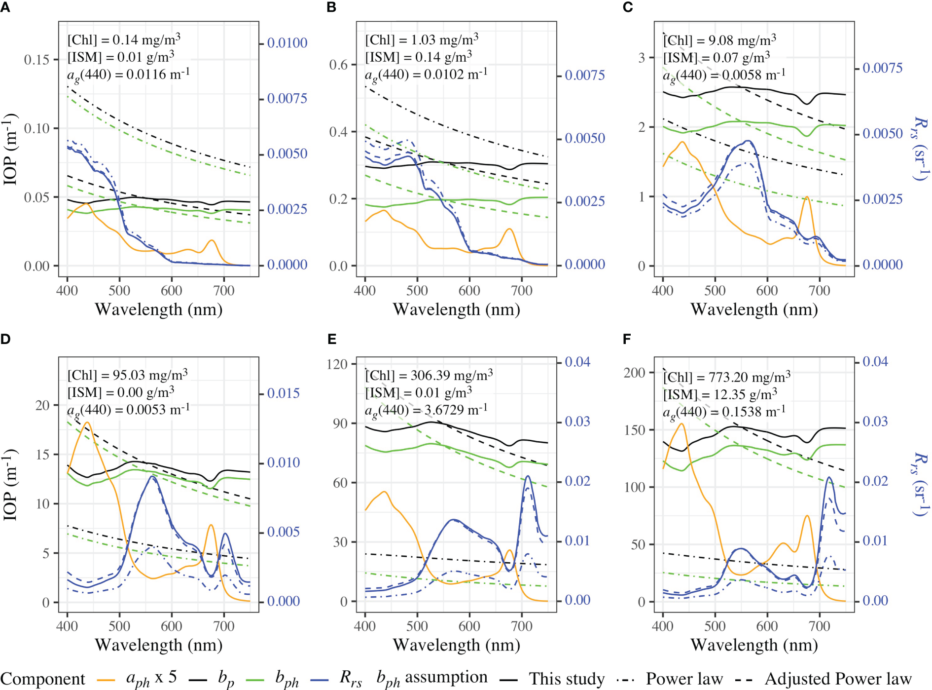 where the subscript x represents different components (w, d, or ph), and is the backscattering probability (or backscattering ratio). This ratio is the fraction of backward scattered light to total scattered light and is assumed to be constant, as no significant spectral changes have been observed (Twardowski et al., 2001; Vaillancourt et al., 2004). While is normally calculated using volume scattering functions that describe the angular distribution of scattered light (Mobley, 1994; Harmel et al., 2021), in this study, fully radiative transfer simulations are not required as the focus is on forward modeling. Therefore, is used as a simplification in the modeling work instead of the entire volume scattering function.
