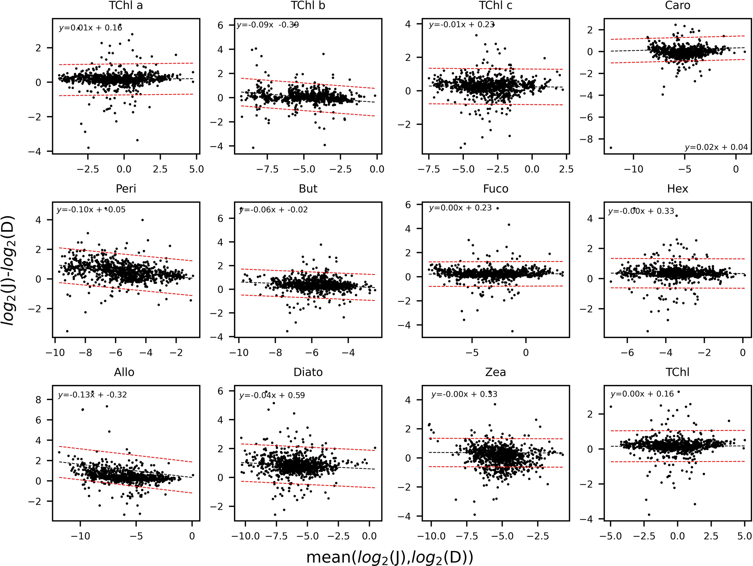 The current study first aims to investigate the uncertainties associated with phytoplankton pigment quantification by comparing the analyses performed on duplicate samples by a certified laboratory and an accredited laboratory applying the same method (Van Heukelem and Thomas, 2001): the Joint Research Centre of the European Commission (J) and the DHI Group, Denmark (D). The comparison with one accredited laboratory allows for a focused examination of the same method applied to various water types and is significant as both laboratories have shown good performance in previous intercomparison exercises (e.g., Canuti et al., 2016). The chromatographic method selected here has been successfully applied to a wide range of pigment concentrations, including oligotrophic (Hooker et al., 2009) and eutrophic coastal waters (Hooker et al., 2005). However, the most relevant aspect of the study is the data set available for analysis, made up of batches of natural samples collected at 957 measurement stations during ship-based oceanographic campaigns and analyzed by both laboratories. These data are representative of different trophic conditions and water types of the European Seas, with TChl a concentration in the range of 0.083–27.35 mg/m3, allowing an extensive comparison to be conducted. The phytoplankton pigments considered for the present exercise are the chlorophylls and the carotenoids most commonly used in marine chemotaxonomic and photo-physiological studies, including the major marker pigments used for classification of phytoplankton groups in ecological studies (Roy et al., 2011). Phytoplankton pigment datasets are commonly used to characterize algal species in terms of phytoplankton functional types (PFTs) or phytoplankton size classes (PSCs). Related investigations have been pursued in the context of ocean color remote sensing, as this would allow a synoptic description of PFTs or PSCs (e.g., IOCCG, 2014; Mouw et al., 2017; Xi et al., 2020). The two most widely used PFT methods are CHEMTAX (Mackey et al., 1996) and diagnostic pigment (DP) analyses. The a priori assumption underlying the chemotaxonomy methods is the covariance of pigments. The inherent uncertainties of chemotaxonomy methods are due to the widespread occurrence of most pigments across many different taxa (IOCCG, 2014). Another known limit is the association of a single pigment with a taxon even though it could be, in some case, not representative of the entire group, e.g., some Dinoflagellates spp. have types of “non-canonical” plastids instead of the Peridinin (Matsumoto et al., 2011), and there are known cases (Naik et al., 2011) where the chemotaxonomy alone leads to incomplete interpretation of the taxa distribution. Despite these considerations, most of the validation of remote sensing methods for assessing phytoplankton community composition is based on chemotaxonomy derived from HPLC pigments. Tracing uncertainties and building uncertainty budgets for descriptors of phytoplankton populations are tasks in progress (Bracher et al., 2017), where uncertainties associated with field data of diagnostic pigments are needed (Xi et al., 2021). The present study obviously contributes to that effort. A second contribution is to explore how uncertainties in diagnostic pigment values propagate to phytoplankton indexes that are at the basis of pigment-based algorithms deriving descriptors of phytoplankton populations such as PFTs (Hirata et al., 2011), therefore providing a benchmark value for that step.