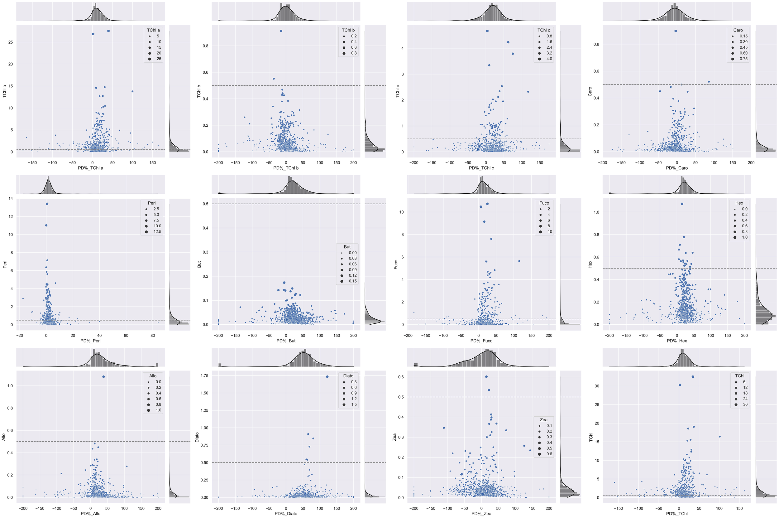 Vidussi et al. (2001) introduced a method that established a connection between diagnostic accessory pigments (peridinin, 19′-butanoyloxyfucoxanthin, fucoxanthin, 19′-hexanoyloxyfucoxanthin, alloxanthin, chlorophyll b, and zeaxanthin) and various taxonomic groups of phytoplankton, enabling the derivation of PFTs across three distinct size classes. These size classes encompassed micro- (> 20 µm), nano- (2–20 µm), and picoplankton (0.2–2 µm), representing a comprehensive range of trophic conditions and taxonomic classes, including diatoms, dinophytes, cryptophytes, haptophytes, green algae, and prokaryotes (Tables 2, 3). Building upon this foundation, Uitz et al. (2006) further refined the methodology by incorporating weighting coefficients for the same set of seven diagnostic pigments. This algorithm required the quantification of DPs using HPLC. These DPs formed a minimal set of marker pigments capable of detecting the primary phytoplankton types (as outlined in Table 3). The determination of PFTs relied on estimating the abundance of each phytoplankton group based on the established relationship between TChl a and their respective quantities (Uitz et al., 2006; Brewin et al., 2010; Hirata et al., 2011). In this work, we apply the known relationships between pigment abundances without any additional adjustments to the coefficients, adhering to the methodology outlined by previous studies.