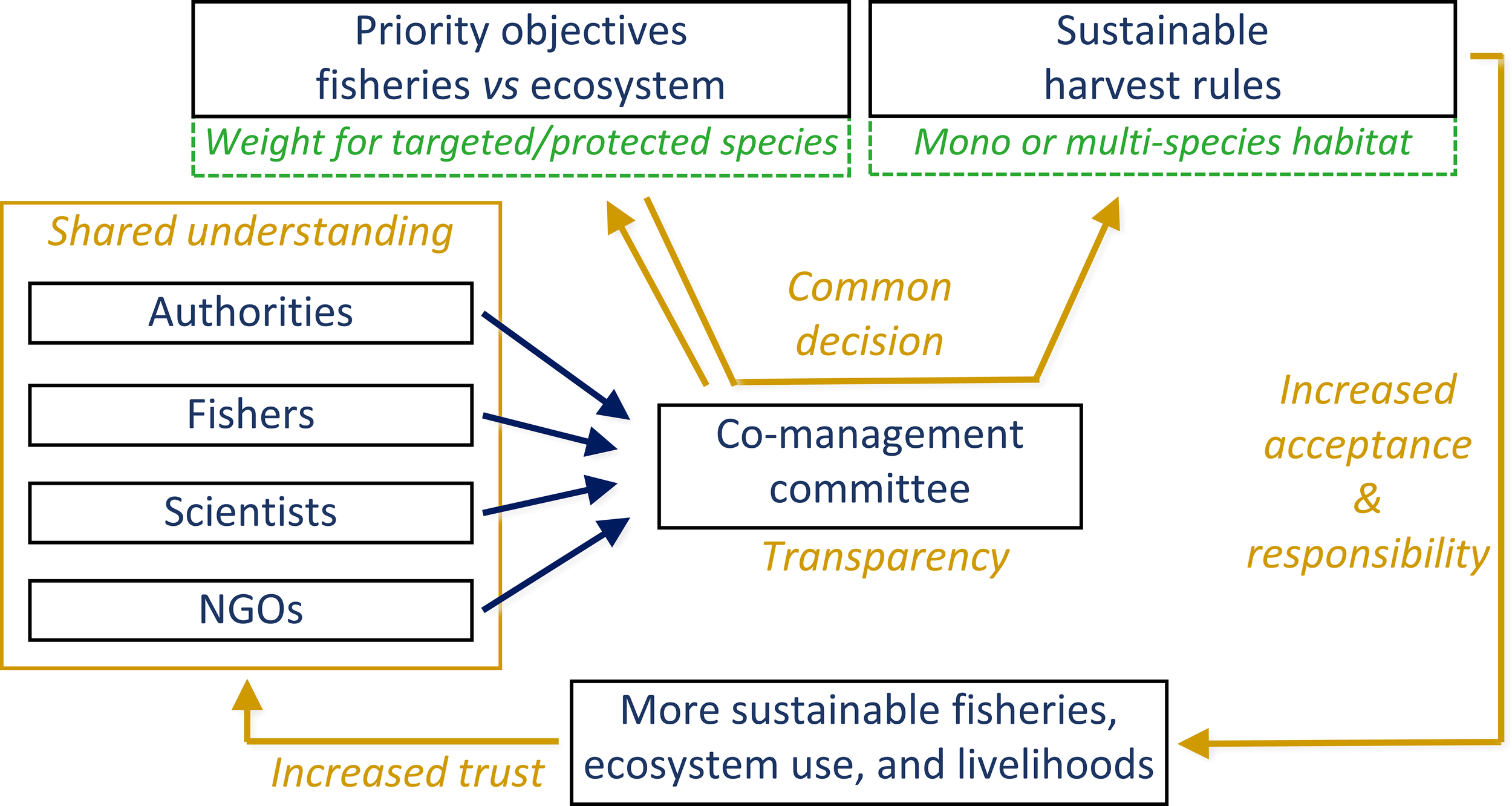 Collaborative management, or co-management, has been defined as ‘the sharing of power and responsibility between the government and local resource users’ (Berkes et al., 1991). The World Bank has defined co-management as “the sharing of responsibilities, rights and duties between key stakeholders, in particular local communities and the nation state; a decentralised approach to decision-making that involves local users in the decision-making process on an equal footing with the nation state” (Soeftestad et al., 1999). Co-management thus refers to the notions of local or regional scale and shared responsibility. Furthermore, when applied to ecosystems, both co-management and EAFM are motivated by the common recognition that marine systems are dynamic and require a holistic approach to manage this complexity (Cucuzza et al., 2021 and below). The literature on EAFM and co-management indicates that traditional management approaches do not take this complexity into account and are often critical in their ability to maintain resilient fish stocks and marine ecosystems in the long term (Cucuzza et al., 2021 and in this paper). Regional co-decision based on EAFM between stakeholders (fishers, scientists, policy makers and NGOs) can therefore address the main barriers of traditional approaches by improving the necessary communication (and associated knowledge) at the local level to jointly agree on responsible decisions in response to complex systems. This local communication and common understanding between stakeholders appears to be essential for building mutual trust and acceptance of measures that can lead to increased compliance and successful management.