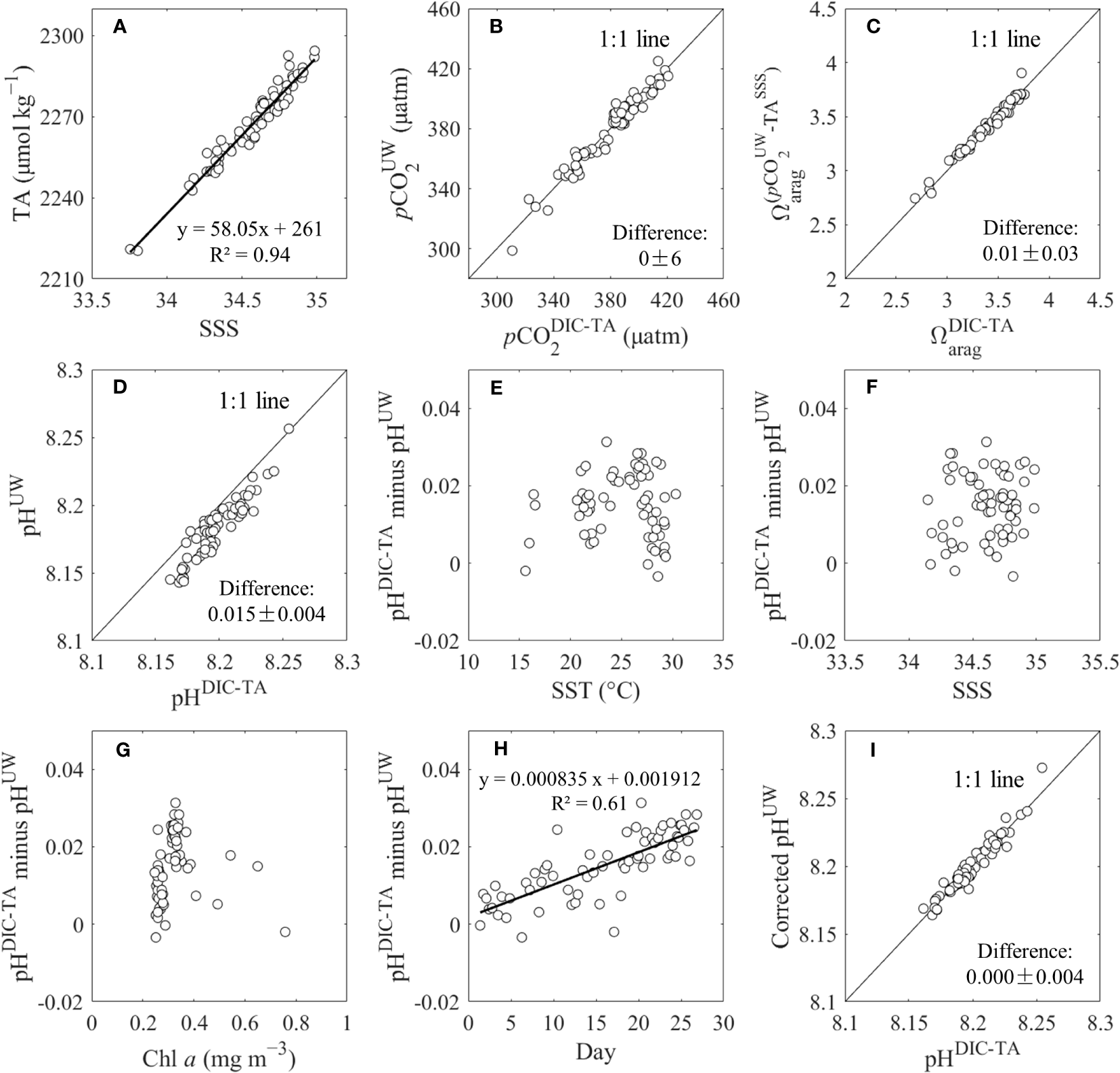 (A) Sea surface salinity (SSS) versus TA, (B) underway pCO2 (pCO2UW) versus calculated pCO2 from DIC and TA (pCO2DIC-TA), (C) calculated Ωarag from DIC and TA (ΩaragDIC-TA) versus calculated Ωarag from pCO2UW and SSS-based TA (TASSS), (D) underway pH (pHUW) versus calculated pH from DIC and TA (pHDIC-TA), (E−H) differnce between pHDIC-TA and pHUW versus temperature, salinity, chlorophyll a (Chl a), and cruise time (day), respectively, (I) corrected pHUW versus pHDIC-TA at stations.