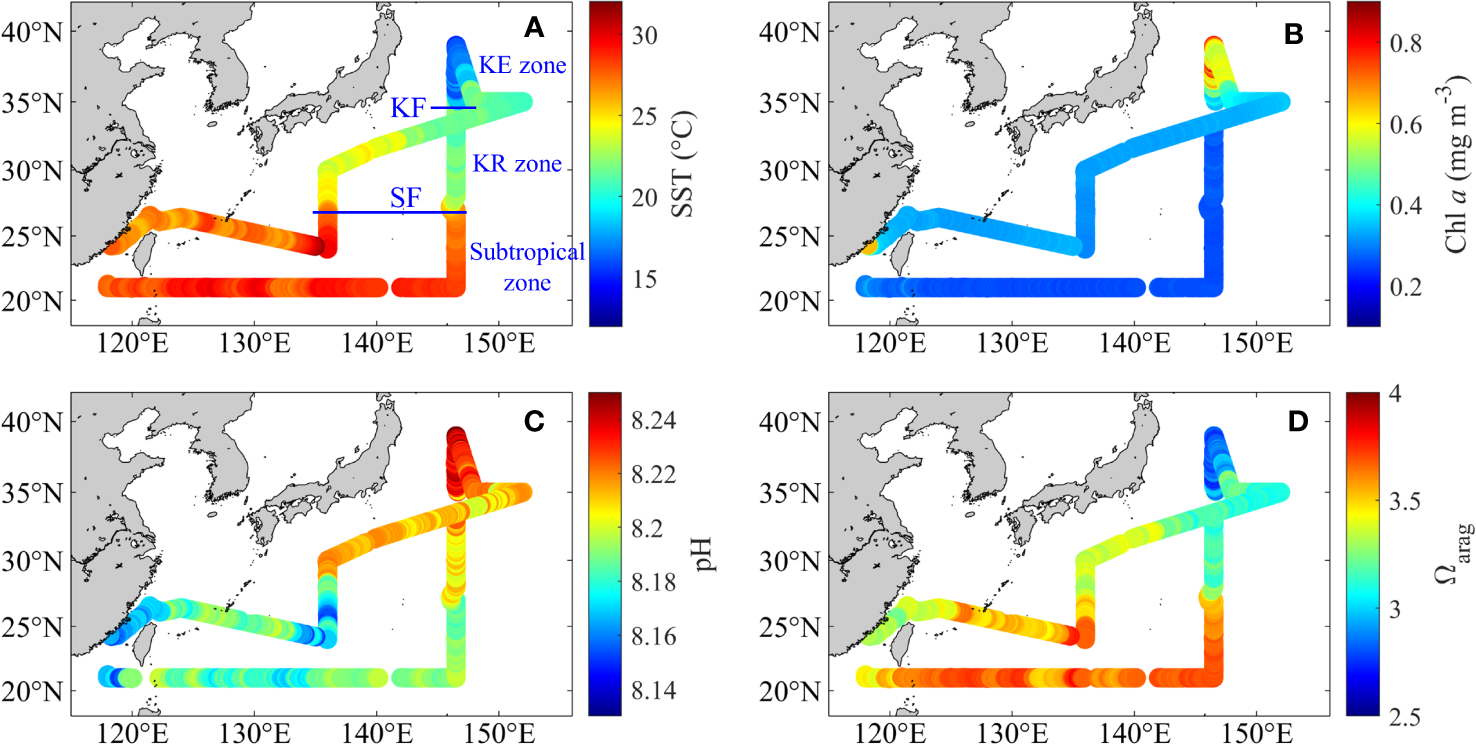 Distributions of (A) underway sea surface temperature (SST, °C), (B) chlorophyll a (Chl a, mg m−3), (C) pH and (D) Ωarag during May–June 2018. (A, B) were obtained from Li et al. (2022a). Subtropical front, SF; Kuroshio front, KF.