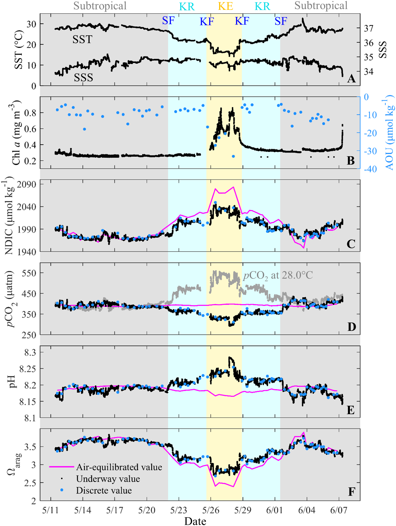 Underway and discrete sea surface (A) temperature (SST, °C) and salinity (SSS), (B) chlorophyll a (Chl a, mg m−3) and AOU (μmol kg−1), (C) NDIC (μmol kg−1), (D)in situ pCO2 (μatm) and temperature normalized pCO2 at 28.0 °C (μatm), (E) pH and (F) Ωarag during May–June 2018. Discrete parameters (blue dots) are collected from the stations. In (C−F), the red lines indicate the air-equilibrated values. Color shading indicates the subtropical, Kuroshio Recirculation (KR) and Kuroshio Extension (KE) zones, respectively. Subtropical front, SF; Kuroshio front, KF.