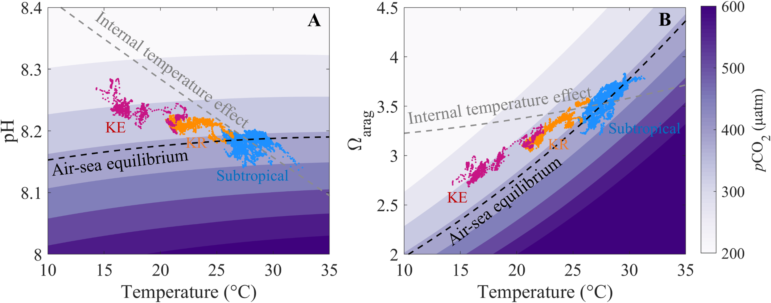Schematic of the relationships between sea surface temperature and (A) pH and (B) Ωarag. The initial condition is set up with subtropical salinity = 34.4 and TA = 2,260 μmol kg−1 to generate the pCO2 contours, with the dashed black line representing the air-sea equilibrium at pCO2 = 390 μatm. The dashed gray line represents the internal temperature effect calculated from salinity = 34.4, TA = 2,260 μmol kg−1, and DIC = 1,945 μmol kg−1 in the subtropical zone. Blue, yellow, and red dots indicate data obtained in the subtropical, Kuroshio Recirculation (KR) and Kuroshio Extension (KE) zone, respectively.