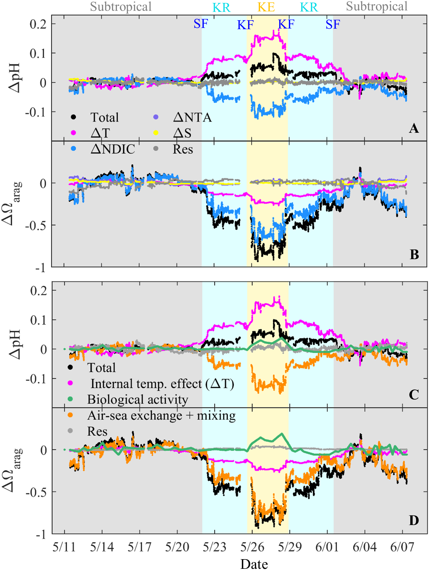 Spatiotemporal changes in pH (ΔpH) and Ωarag (ΔΩarag) (A, B) due to individual parameter changes in NDIC (ΔNDIC), NTA (ΔNTA), and temperature (ΔT), salinity (ΔS), and residual (Res), and (C, D) due to individual processes of internal temperature effect, biological activity, air–sea gas exchange and vertical mixing, and residual. These changes were calculated from the real-time values relative to the mean value in the subtropical zone (temperature = 28.0 °C, salinity = 34.4, TA = 2,260 μmol kg−1, and DIC = 1,945 μmol kg−1). Color shading indicates the subtropical, Kuroshio Recirculation (KR) and Kuroshio Extension (KE) zones. Subtropical front, SF, Kuroshio front, KF.